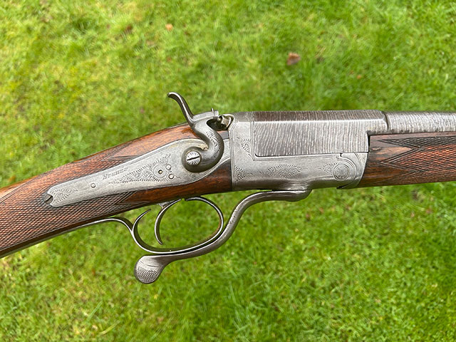 A 16-bore single hammer gun by Hughes. 30" Damascus twist barrel, nitro proof, cast off 1/8", very good condition. A lovely gu for walking-up over the dog.