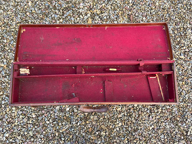 A leather single gun case for re-lining. Leather in sound condition, lock working, brass corners. Length 32", width 8 1/2" blocked for 12-bore with 30" barrels. A good start for a hobbyist with the time and inclination to partly re-block and re-lie a case for a victorian shotgun.