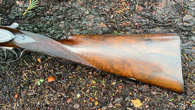 A nice bar-action Rigby hammer gun with rebound locks and good 30" Damascus barrels. Originally proofed under 1875 rules, re-proofed at .729" and re-browned, showing attractive figure and colour. Stock with nice figure and colour with some historic dents and scratches, chequer refreshed, heel and toe plates.