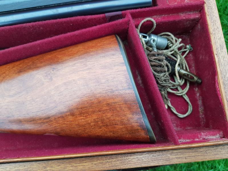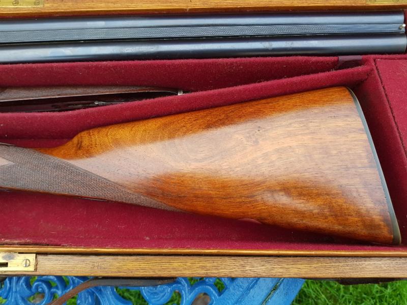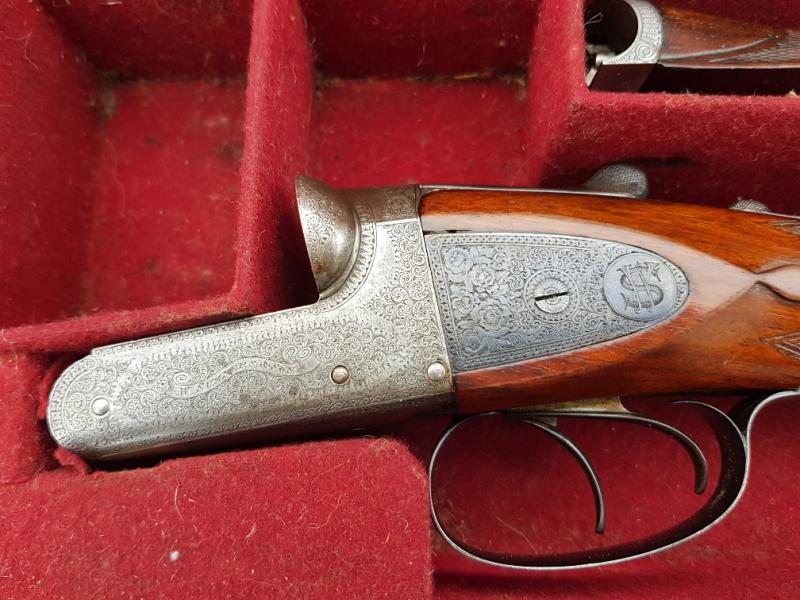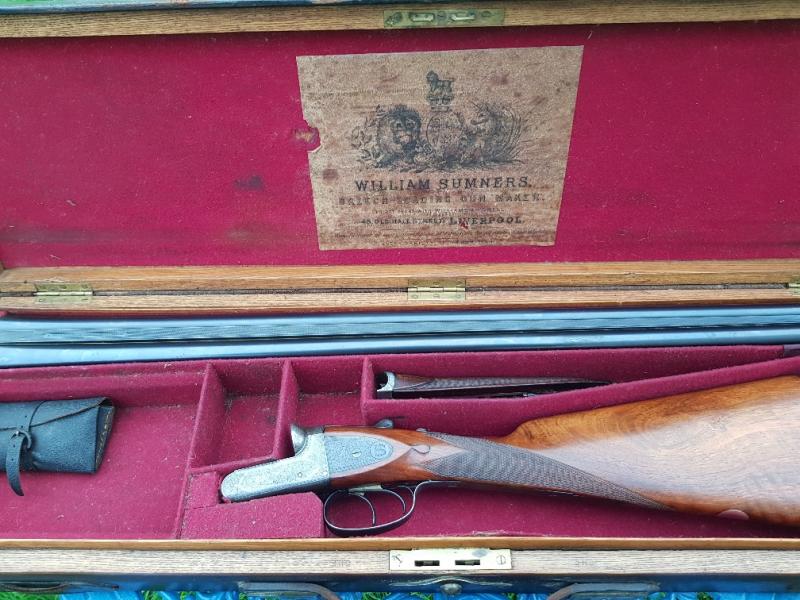 A pretty and unusual side plated boxlock non ejector by William Sumners. Action looks like a Westley Richards. Barrels well sleeved by T. Wild. The case has the initials CWMS, suggesting the gun was made for Sumners' son. The Middlesex Regiment earned the nickname 'Die Hards' at the battle of Alburerer in the Peninsular War, under the Duke of Wellington.