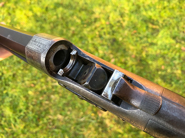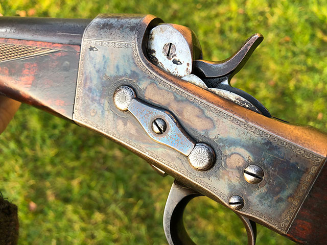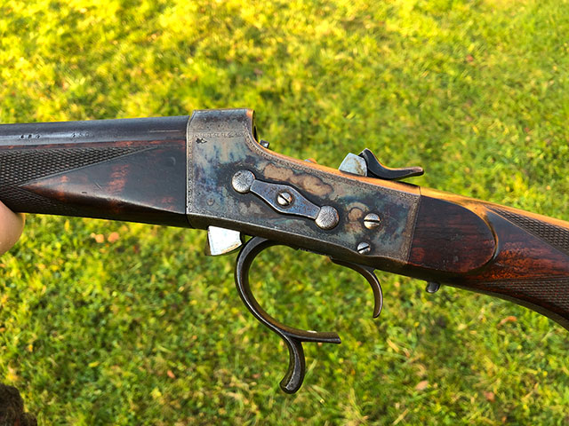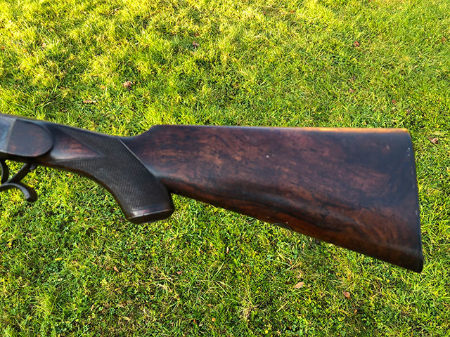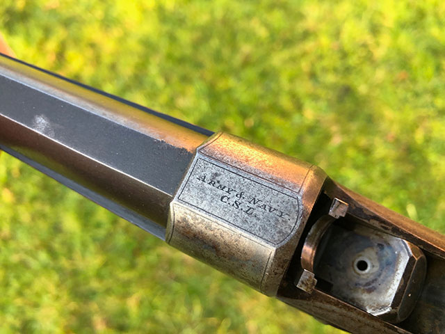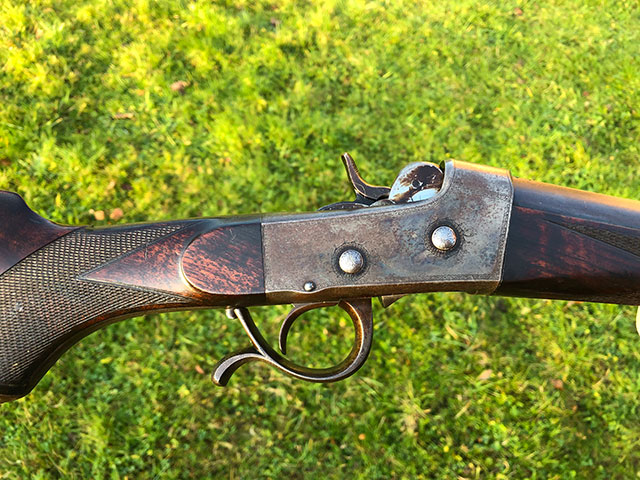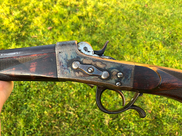 A rare and unusual Army & Navy rolling-block single shot rifle. Highly figured pistol grip walnut stock with steel grip cap and horn butt plate.Folding leaf sights to 100,150 and 200 yards. Retaining a good deal of original finish and patina. Original case colours on most of the action, silver oval. Very good bores. Requires a new firing pin, which we can make and fit. Mechanically excellent.