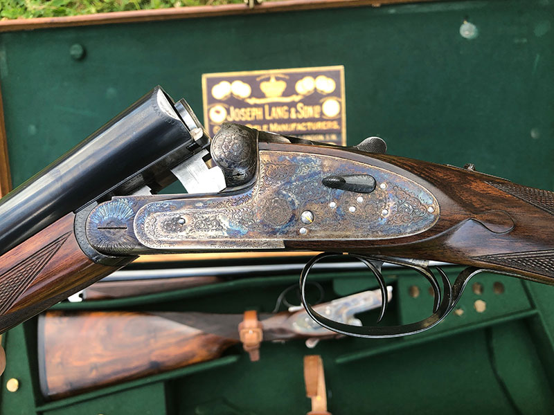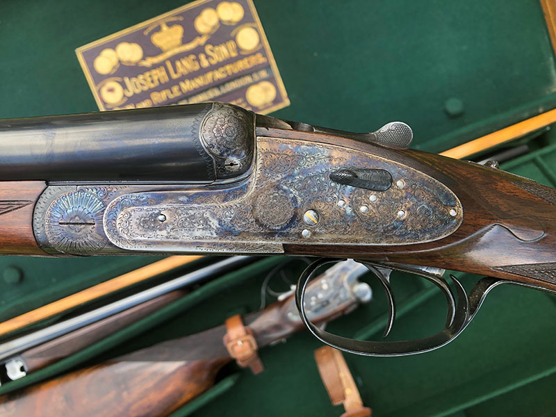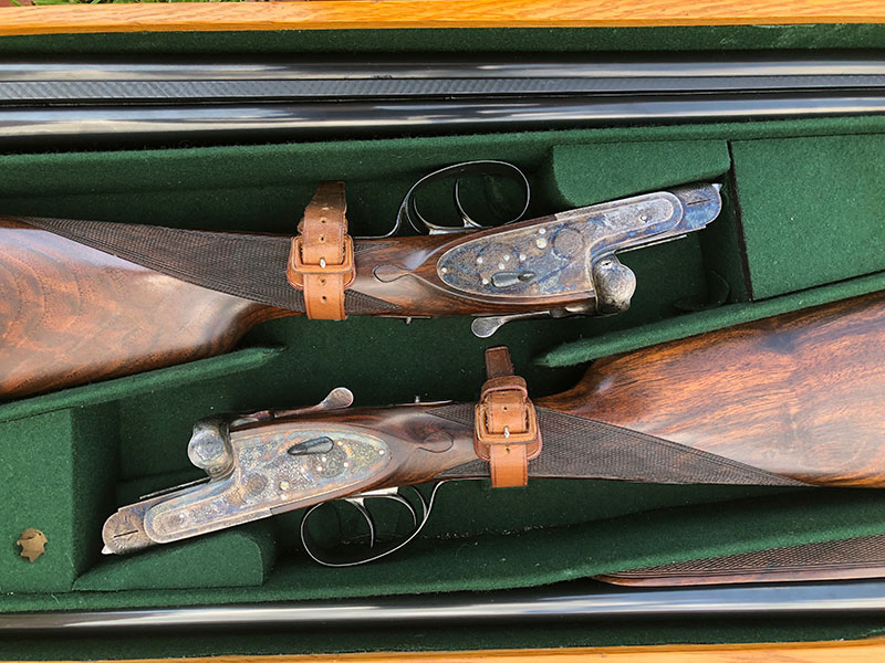Spanish copies of the Holland & Holland self-opener, in almost new condition. Cased in a vintage oak and leather case, specially re-fitted. Excellent guns - ideal as a spare pair for wet days or when you wnat to keep your best English guns out of the worst weather.