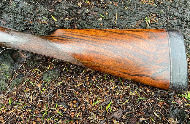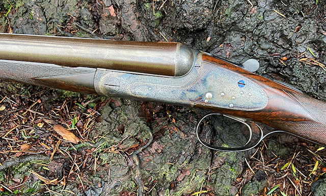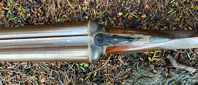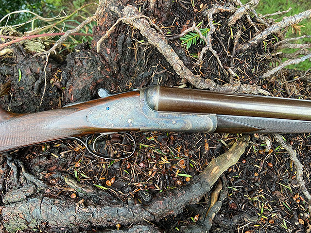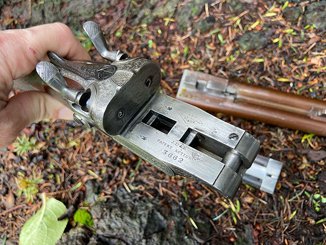 A very shootable and fully restored Boss round body game gun with Damascus barrels. Renewed case hardening colours remain strong and the gun is mechanically excellent, featuring the Boss single trigger and Boss ejectors, both working perfectly. Made in 1895 for R.G. Kirby as No.2 of a pair. Actioned by John Robertson.