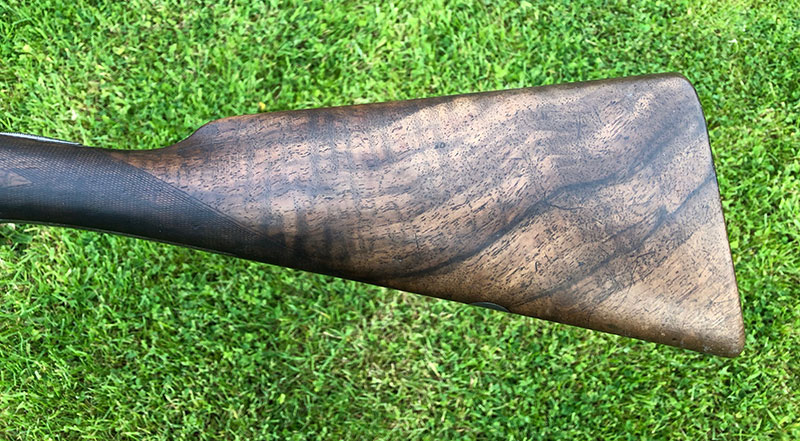 A good Charles Boswell boxlock in perfect working order with beautiful damascus barrels. Made with 2 3/4" chambers and proofed for 1 1/4oz of shot, which is unusual for a game-weight gun. A pefect candidate for a sympathetic cosmetic restoration. Chequer worn but nicely figured wood.