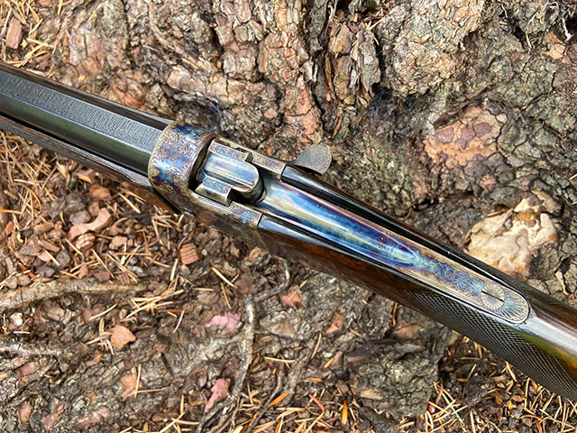 A beautiful and very rare small-frame, take-down version of the 1881 Deeley & Edge patent falling block rifle. Made in 1894 in .297/250, this is teh smallest bore rook rifle makde in this configuration. The few others known are in .300 Rook. The rifle has been fully and professionally restored, including renewed case hardening by St.Ledger. It shoots two rounds on top of one another at 50-yards (target supplied with rifle). It is presented cased in a professionally re-lined, period rook-rifle case, with Cashmore label.
