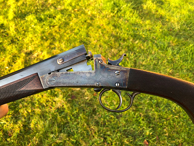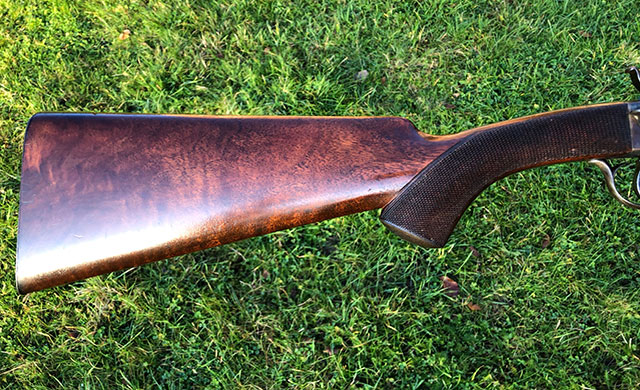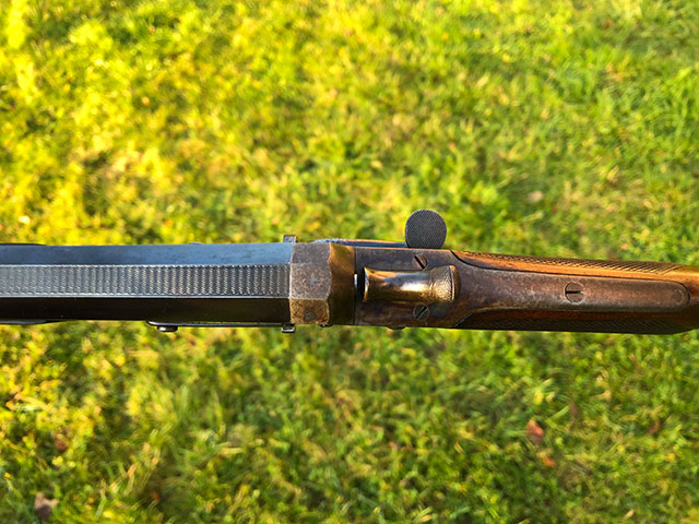 A nice, clean and original rook rifle with central hammer, retaining a lot of original finish to wood and metal. Very good bore. Leaf sights to 50, 100 and 150 yards. Cased.