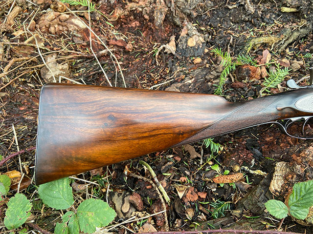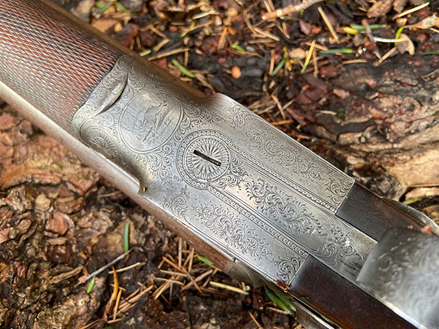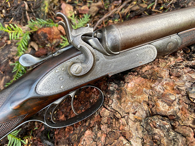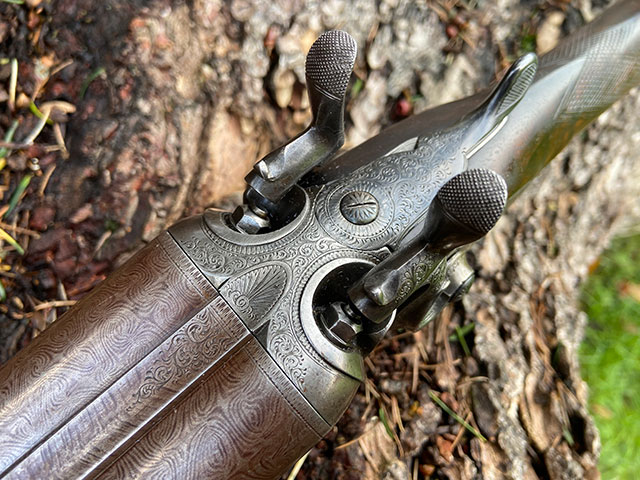 A nitro proof 12-bore damascus barrelled hammer gun by Cooper & Goodman. Nice quality all over, Thomas patent bolting system, ornate hammers, engraved with scolls and game scenes. Full metal buttt plate. 6lbs 14oz, nicely figured stock, a very good game gun in good mechanical and cosmetic order.