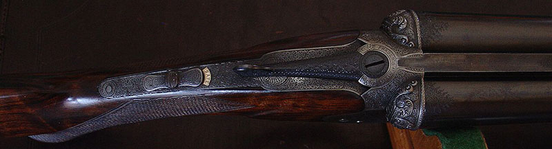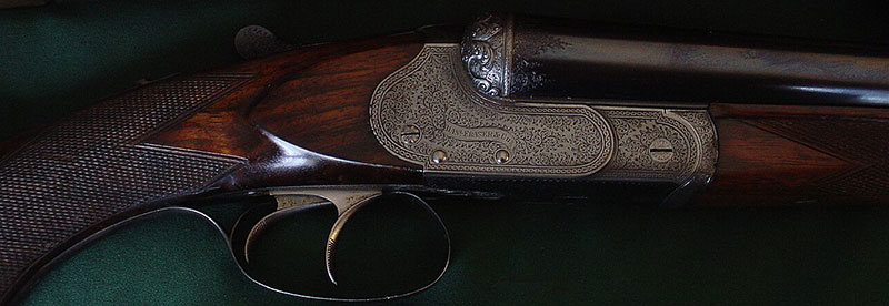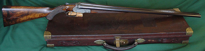 A typically high quality and distinctive Fraser best boxlock with intercepting safety sears. Carved fences, sylised rope borders and fine scroll engraving. Nice, dark, figured stock and chequered triggers. Cased with accessories. As fine a quality boxlock as you can buy.