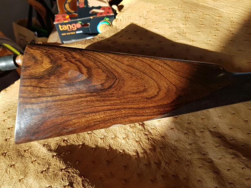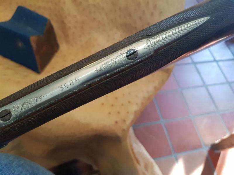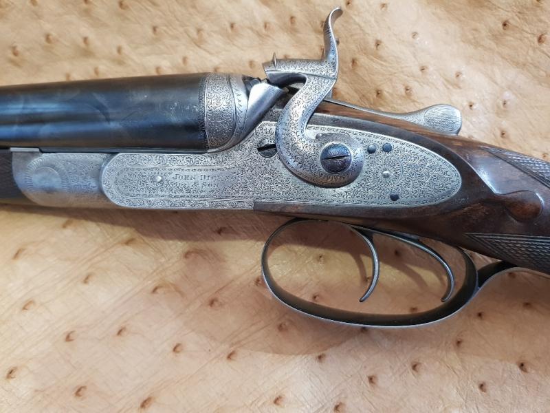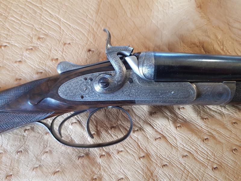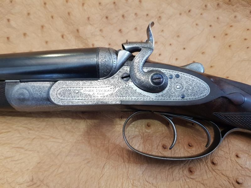 Made in 1877, sleeved to 28 1/2" and nitro proofed. The gun has been re-stocked and is now in very good order, ready for use with standard steel cartridges and a pracical classic in all respects. The gun has lovely, bar-action locks and rebounding hammers, elegant percussion fences and fine scroll engraving. Dickson 16-bore hammer guns are vary rarey seen.