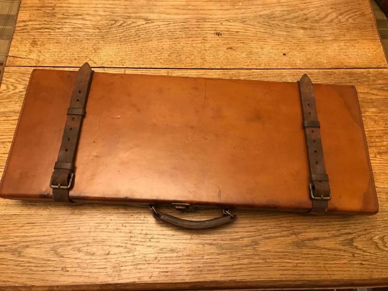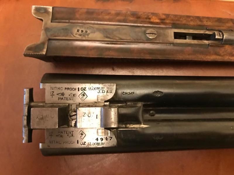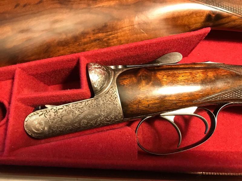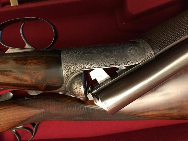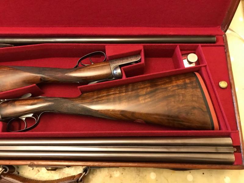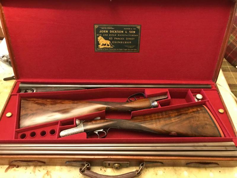 A matched pair of rare 16-bore round action guns by John Dickson of Edinburgh. The pair match well but could be enhanced to suit the customer, regarding length etc. One gun has original damascus barrels, teh other has ben sleeved. Cased in a Dickson leather double case with trade label.