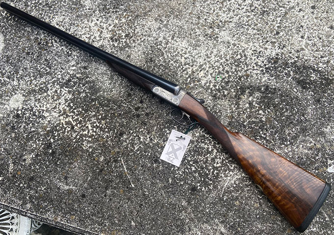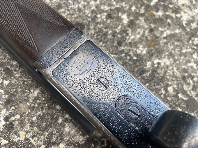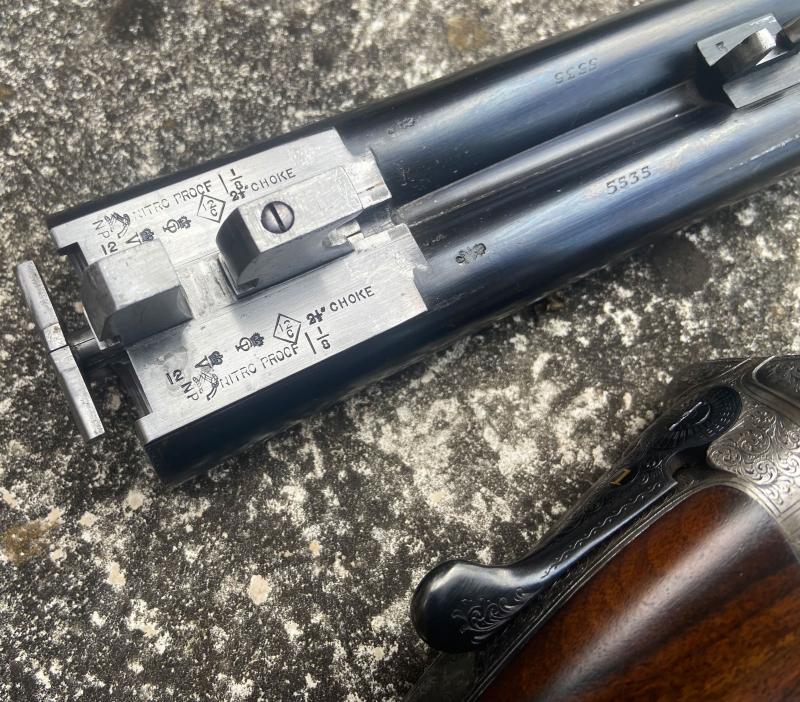 A nice example of a lightweight Churchill XXV easy-opening 'Utility' model game gun. Very much the epitome of the Churchill philosophy: a best quality boxlock, retaining crisp engraving and a blush of original case colour, re-blacked furniture and a nicely figured stock with leather covered Silver's pad. Rib is the classic Churchill raised, taper with matted surface.