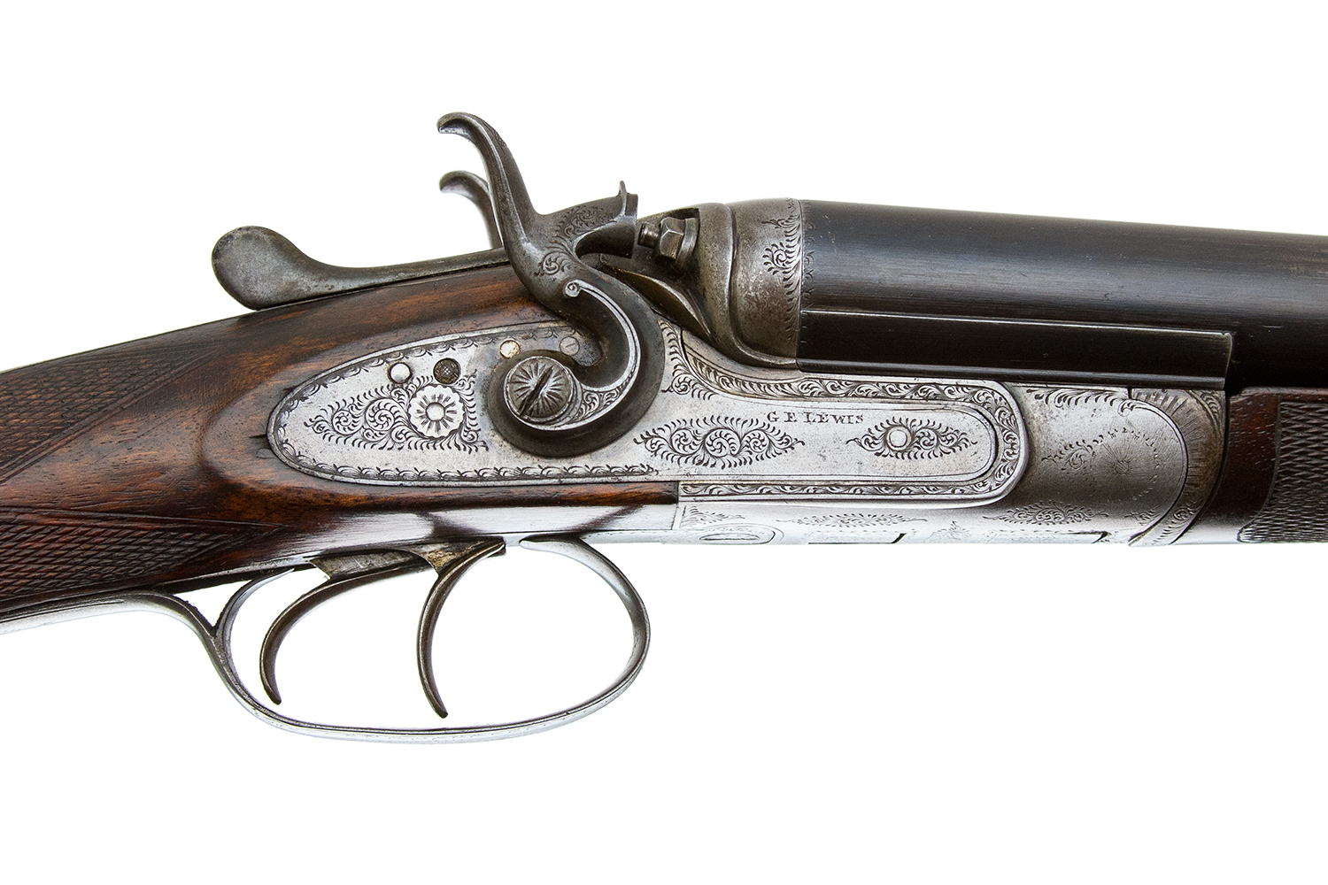 A heavy 20-bore bar-action hammer gun by G.E Lewis, who was best known for his wildfowling guns. Well-shaped fences, good scroll engraving and sound overall. At this weight it will shoot 2 3/4" cartridges comfortably.