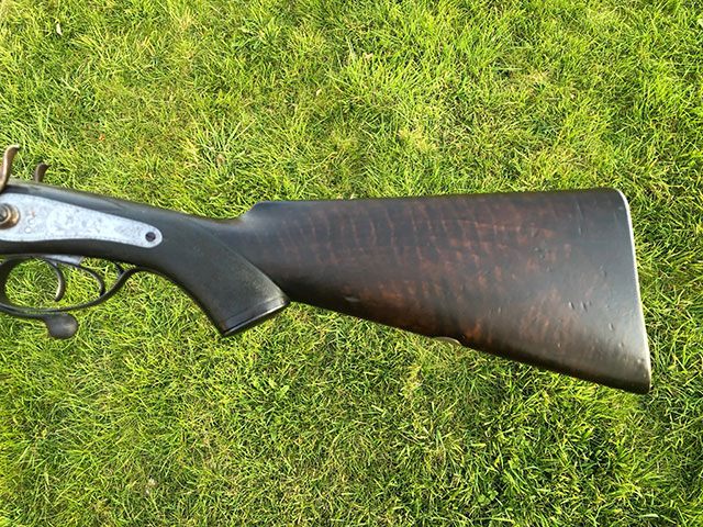 A high quality G.E. Lewis 10-bore live pigeon hammer gun. Section 58 Obsolete can be sold as a curio (no need for a licence) if desired. Beautiful Damascus barrels, Jones under-lever action. Serviced and in good mechanical order. Bores show some pits but very thick barrels, certainly shootable.