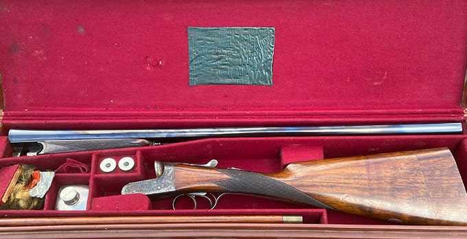 A lovely original example of a 1930s lightweight boxlock ejector made for the 2" cartridge, firing 25 grams of shot. Easy to carry on long walks or in heavy cover. Fast handling and ideal as a walked-up gun. Cased in its original Gale leather case with faded trade label, accessories and cleaning rods. We willl supply this gun in the UK with 200 new Eley 2" cartridges. Unfortunately, we cannot export ammunition but RST make and sell a 2" load in the USA.