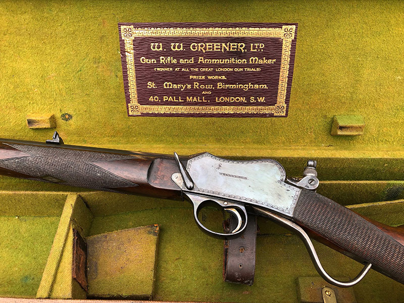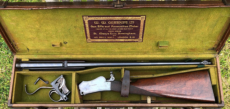 A very good example of a Greener .22 rimfire Martini-action, ake-down rifle with detachable mechanism, cased and fitted with a period 'scope. Cased in its period case with W.W Greener trade label.