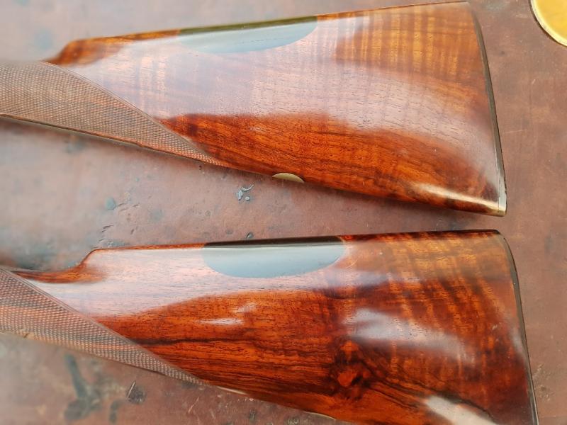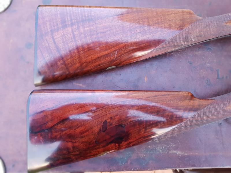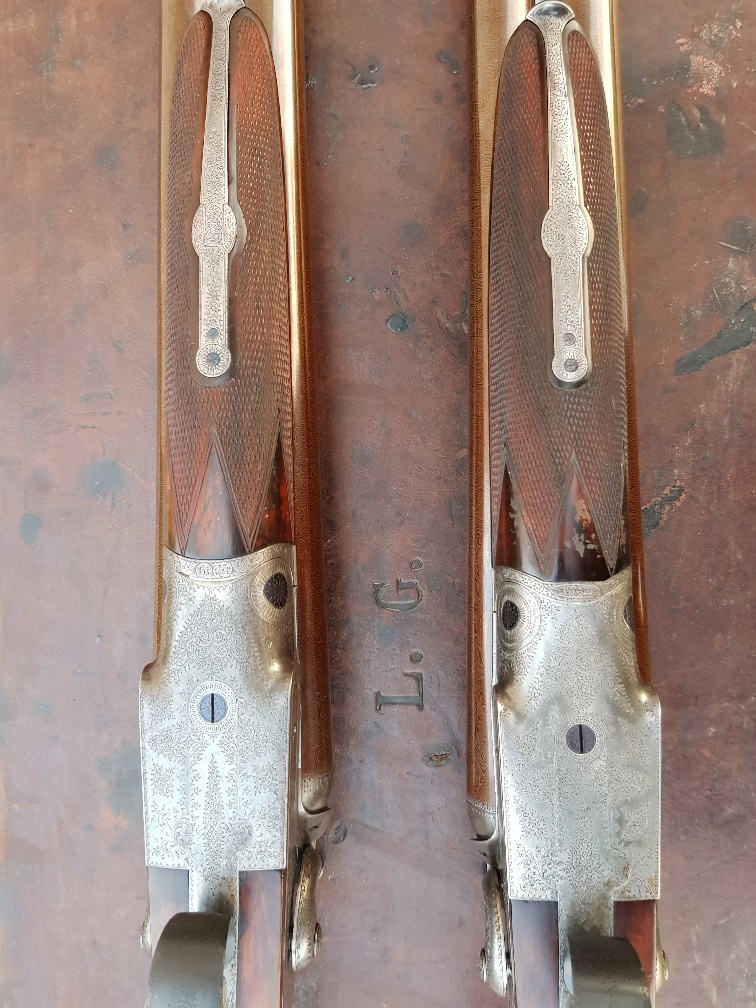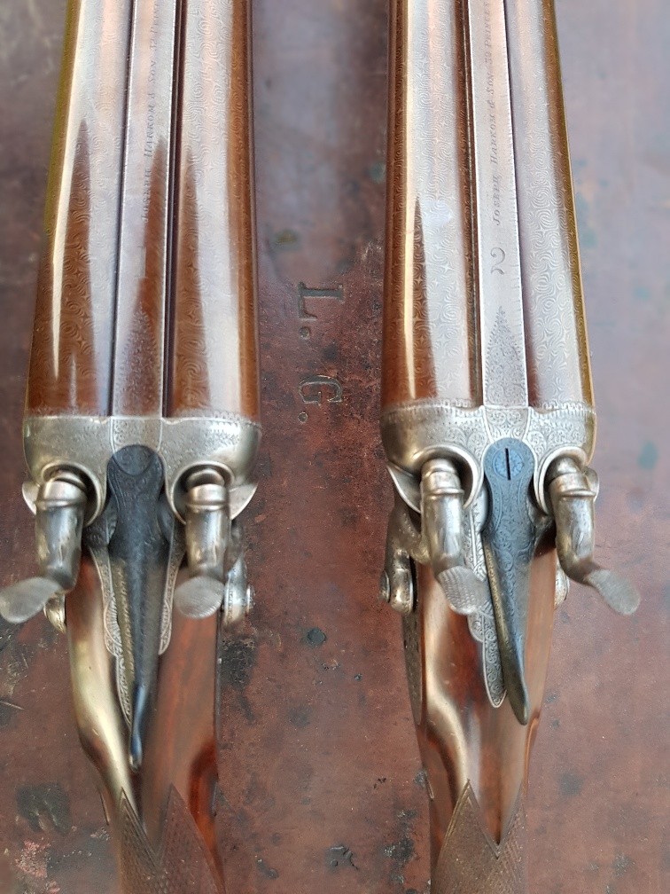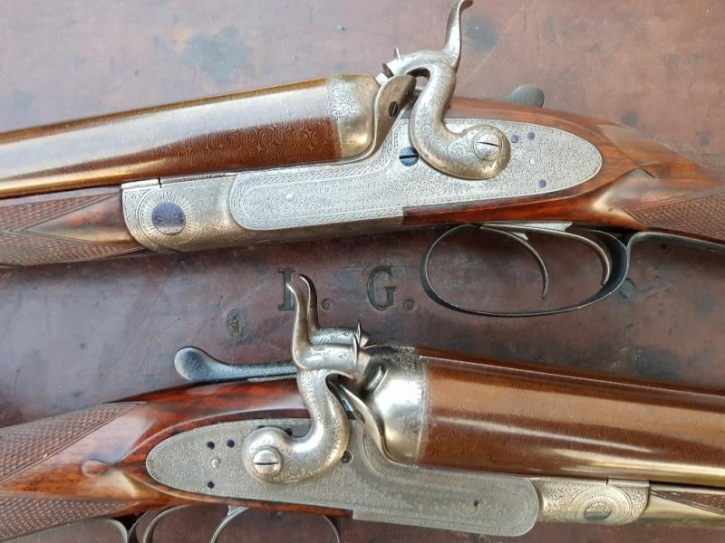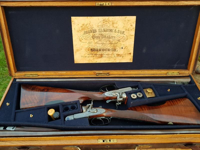 Pair of 12 bore Hammer guns by Harkom , Edinburgh nos. 1563 and 1983. A composed, but identical , pair of top lever guns made for the 5th Earl of Warwick in 1882 and 1897 and gifted to his son Leopold Greville ( styled Lord Brooke between 1893 and 1924) . He succeeded to the title “ 6th Earl of Warwick “ in 1924 and died in 1928 . He was appointed a Member of the Royal Victorian Order in 1905 and in November of that year ( aged 22 ) was invited to a four day shoot at Sandringham by King Edward V11. Other guns attending included the Duke of Marlborough and Lord Lovat and on the fourth day of the shoot the estate's record bag of 1342 grey partridge was achieved . Also included is a pair of Harkom canvas cartridge magazines marked L.G. as is the oak and leather case for the guns .