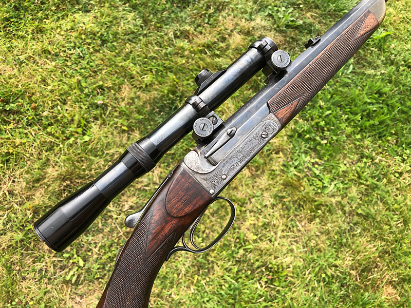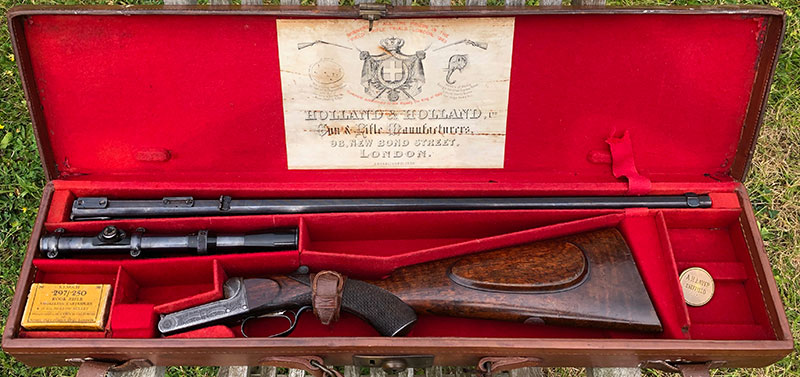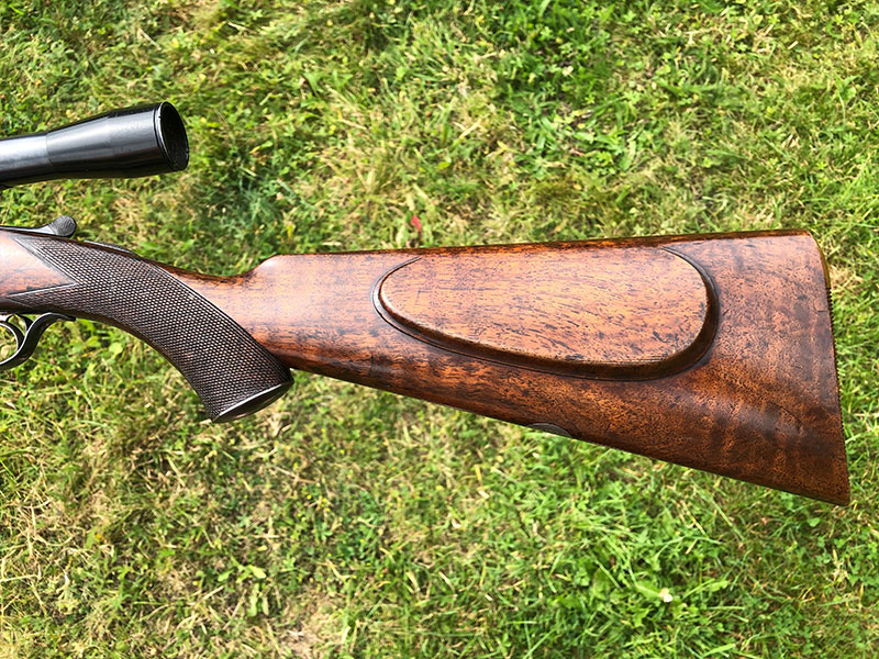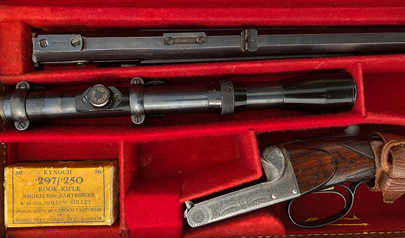 A lovely example of Holland & Holland's 'Royal' rook rifle, converted from .297/.250 Rook to .22 rimfire. This was H&H's best quality rook rifle and build quality is superb. Fitted with period 'scope and hand-detachable mounts. Cased with correct H&H trade label. As good as you will find.