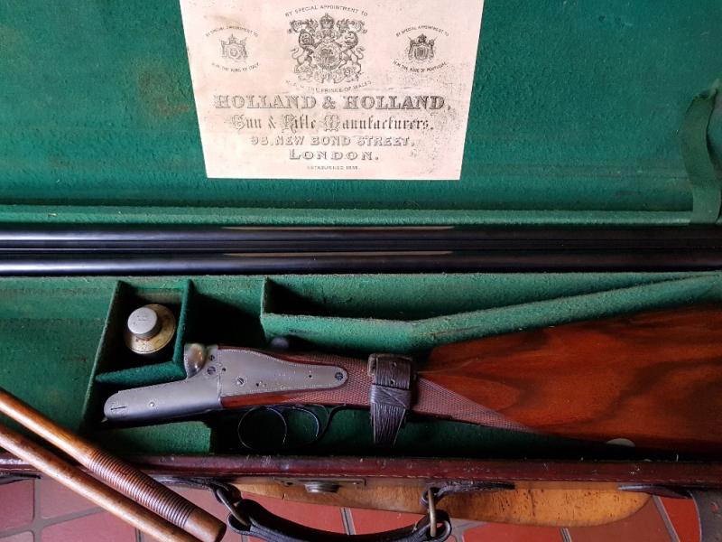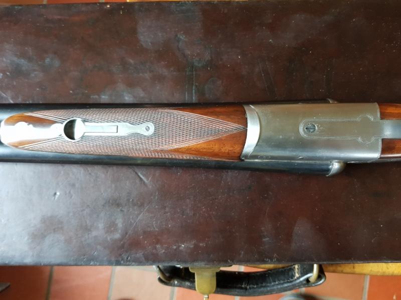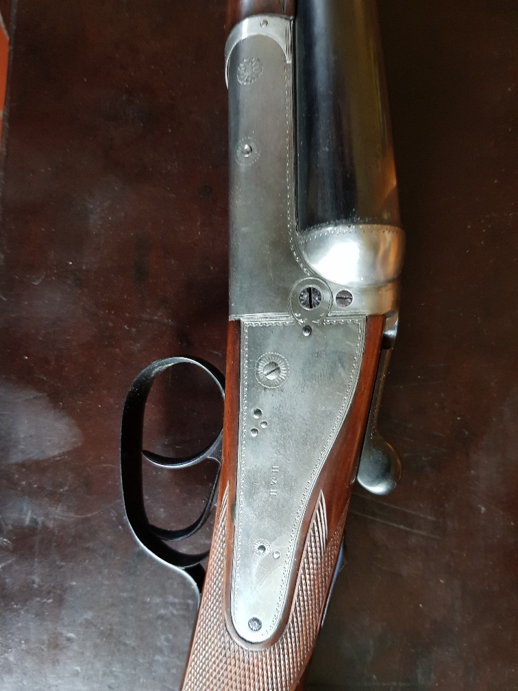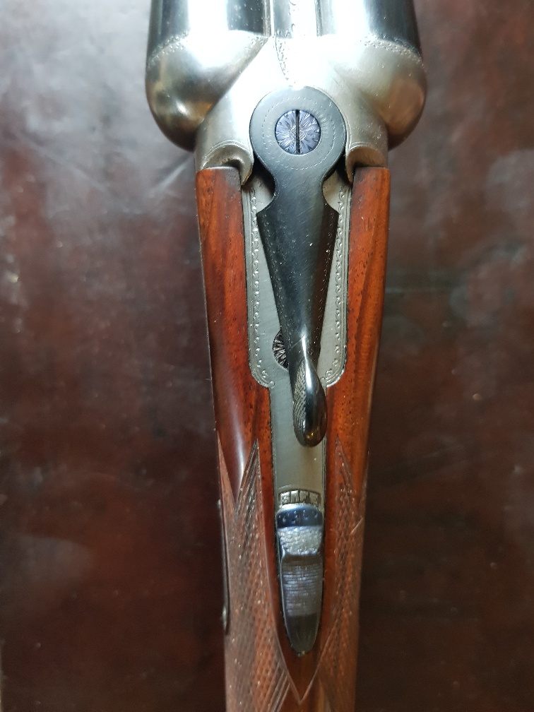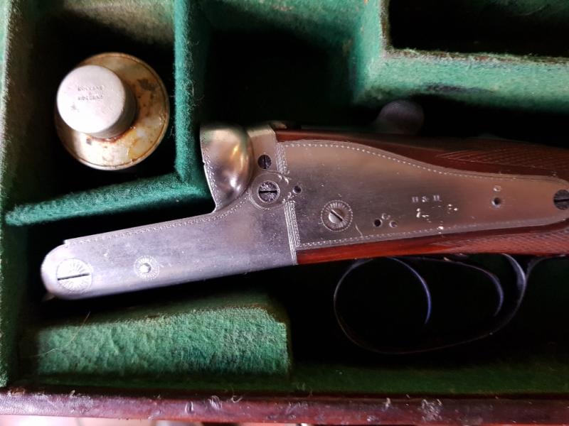 'Dominion' model, back-action, sidelock with sleeved barrels and 2 3/4" nitro chambers. Comes complete with maker's case and trade label, cleaning rods, oil bottle etc.