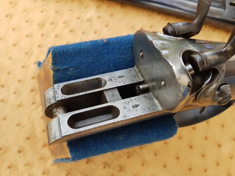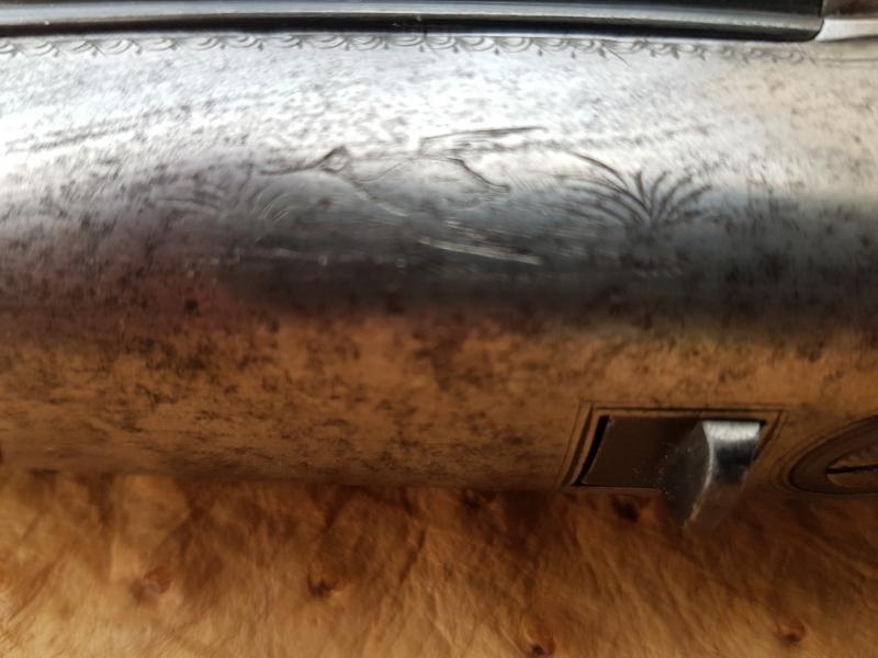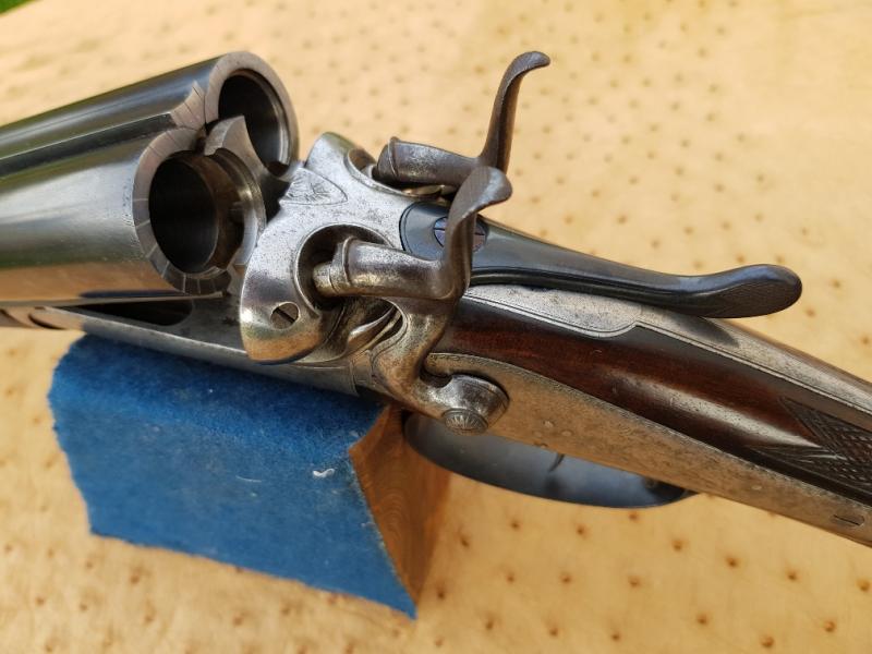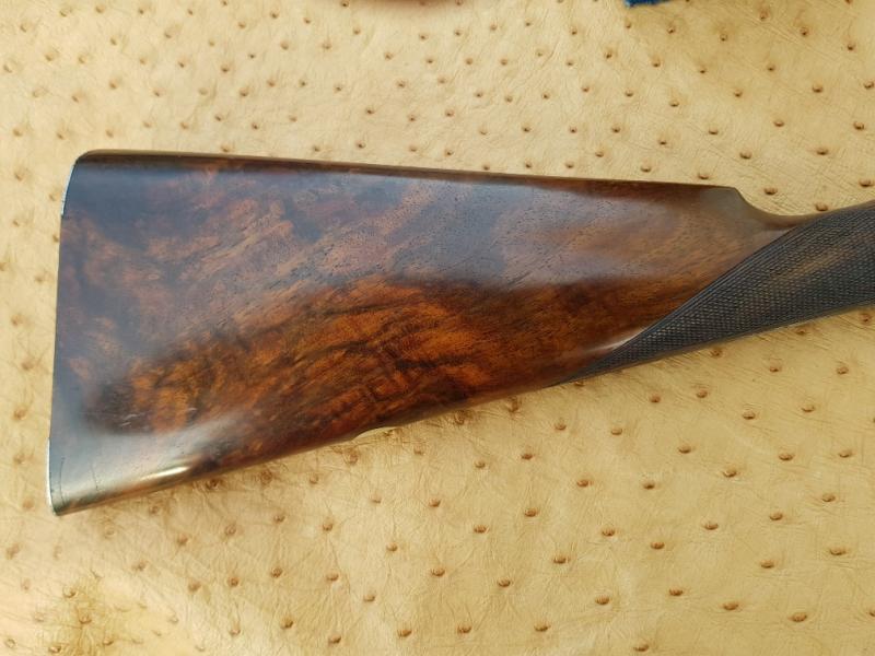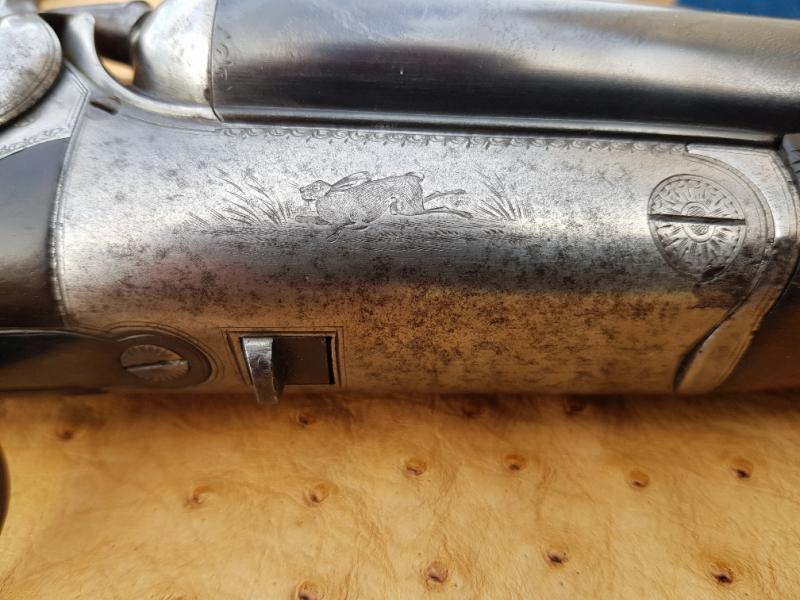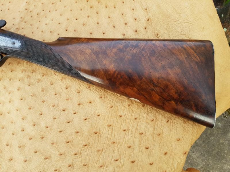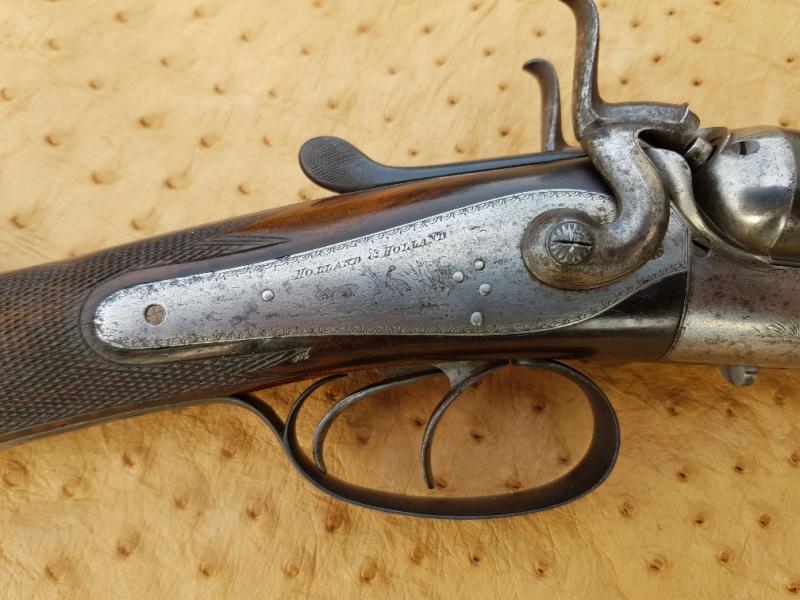 Holland & Holland 12-bore hammer gun with rebounding backlocks, made in 1876. Well figures stock with heel and toe plates. Border and game scene engraving. Barrels well sleeved and nitro proof. Single sliding bolt action, operated by a top-lever.