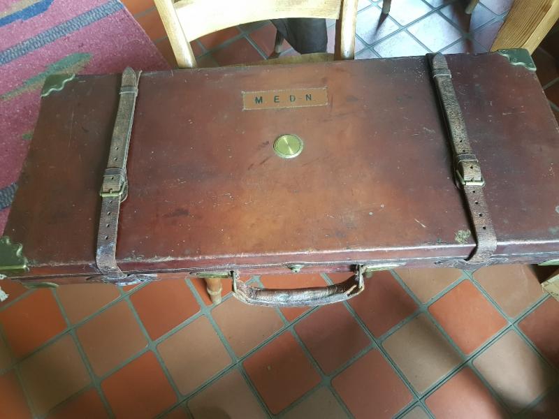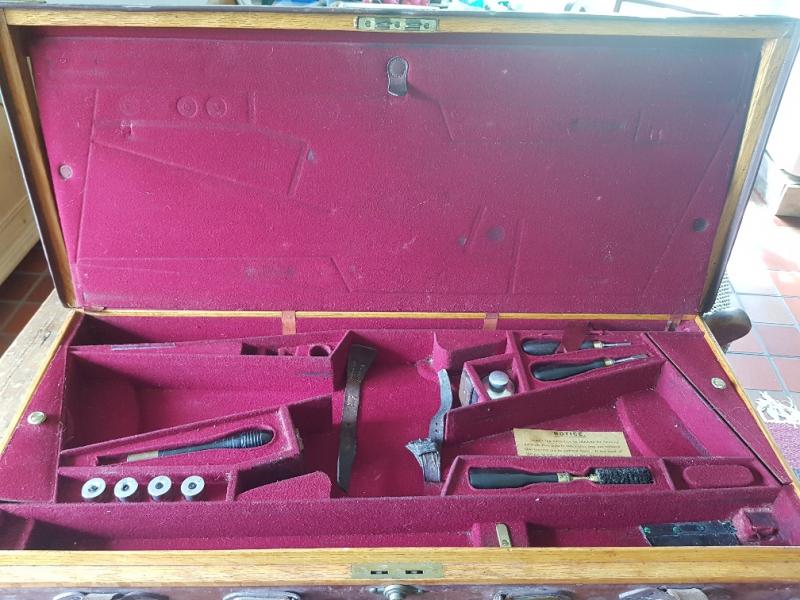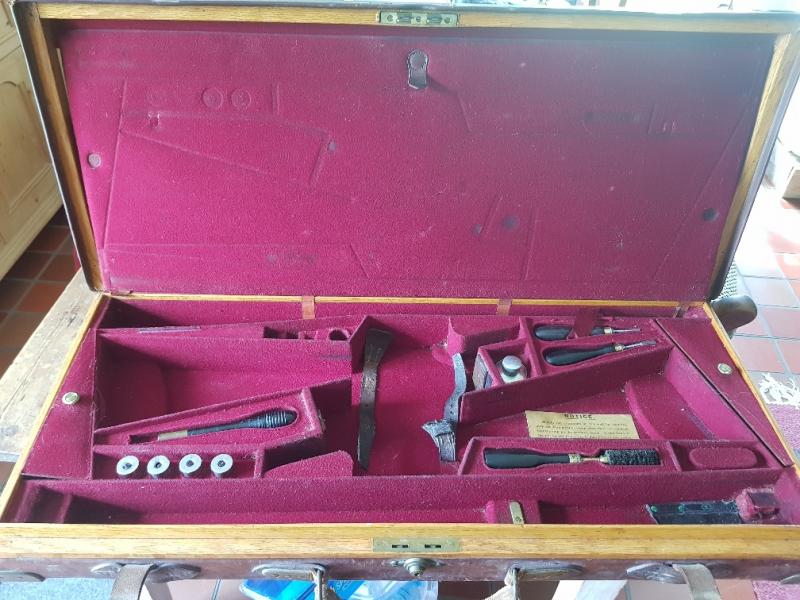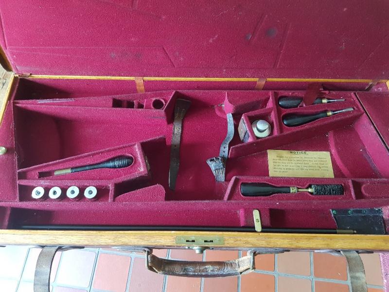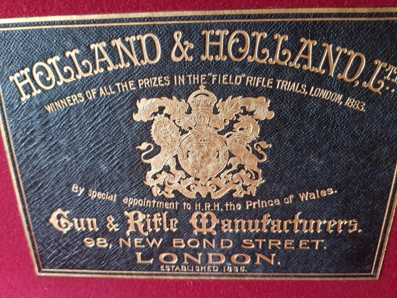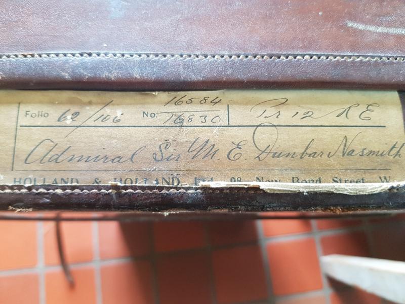 A very good Holland & Holland oak and leather double gun case. Original straps and handle, original interior labels in tact. Made for Holland & Holland guns No.16584 & 16830. It was the property of submarine Captain (later Admiral) Martin Dunbar Nasmith V.C. A vintage storage label from Holland & Holland notes both his name and the gun numbers. All accessories in the case are included in the sale price.