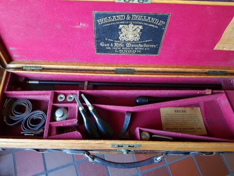 A good oak and leather Holland & Holland gun case, fitted for 28" barrels. Red baise lined with trade label and accessories.