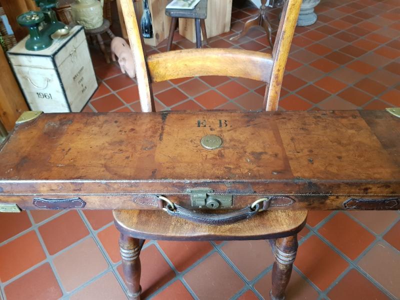 A solid, robust leather case with brass hardware and corners. Blue lined with Holland & Holland trade label. Made for a 12-bore Paradox, with compartments for loading tools etc. Leather in good condition, original internal fitments. Blocked for 30" barrels.