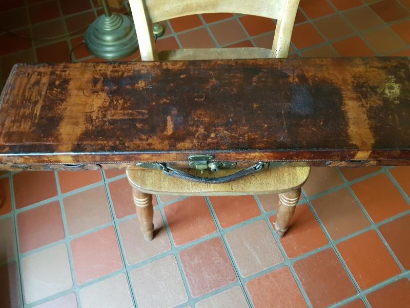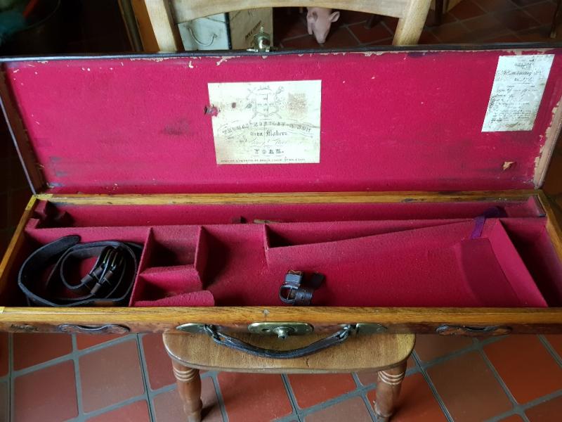 Red baize-lined, oak and leather gun case for 30" barrels. Originally for a Thomas Horsley 12-bore hammer shotgun. Horsley trade label on lid, partitions sound.