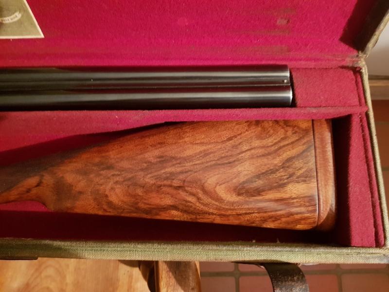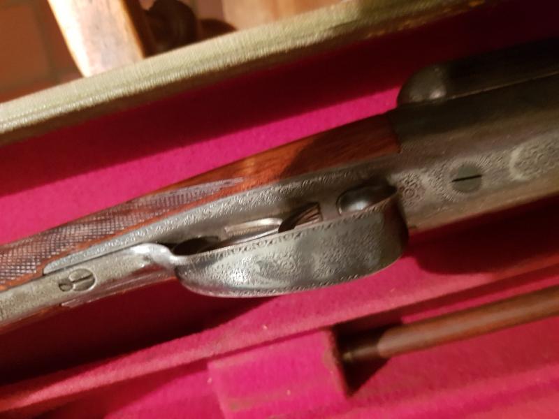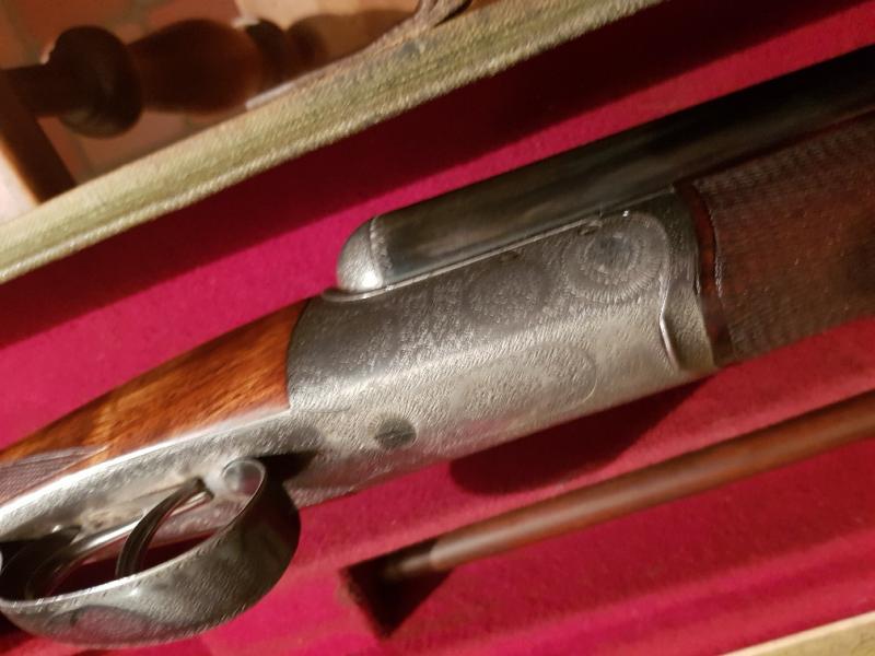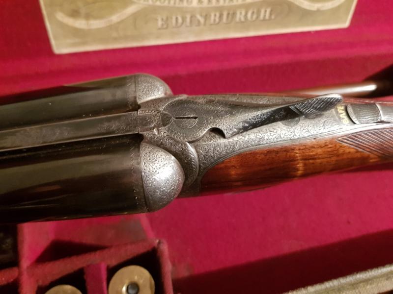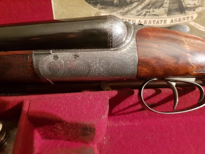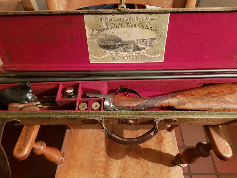 John Dickson round action gun made in 1925, cased with trade label and accessories.God order overall, top lever action with third fastener. Scroll engraved action with gold 'SAFE'. 28" nitro proof steel barrels with 2 1/2" chambers.