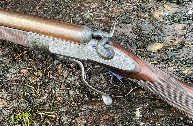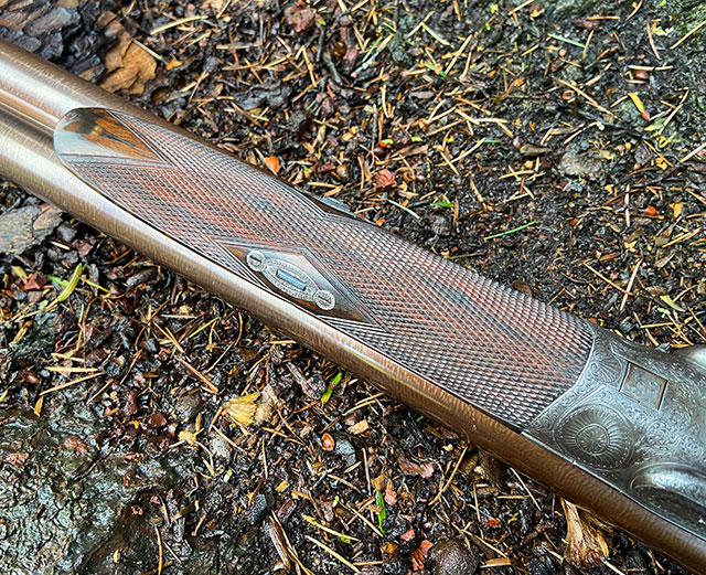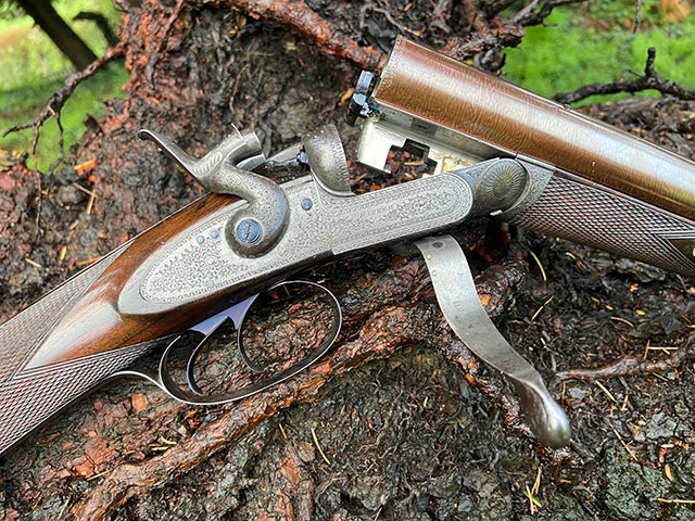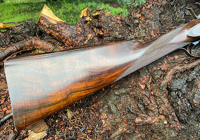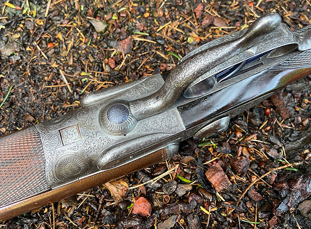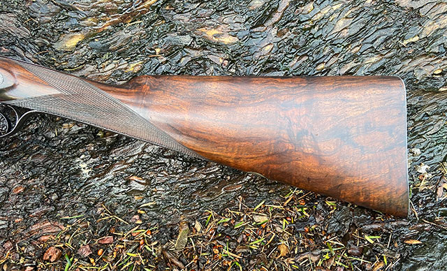Best Scottish quality is evident all around this 1870s Joseph Harkom bar-action hammer gun. Professionally and tastefully restored and mechanically perfect. Highly figured stock, non-rebound locks and Jones under-lever and screw-grip operation combine to make this a classic of its era. Modern nitro re-proof.