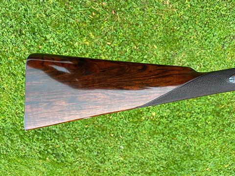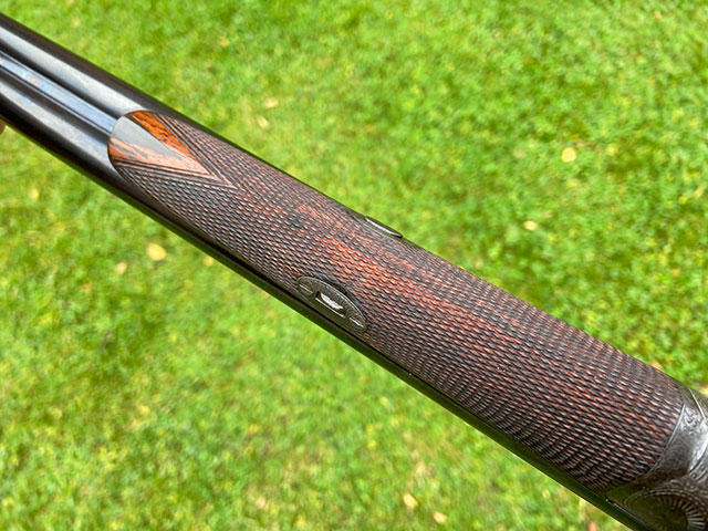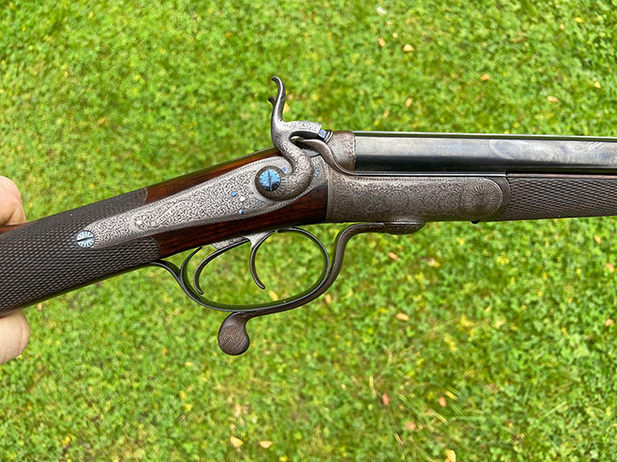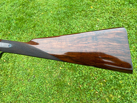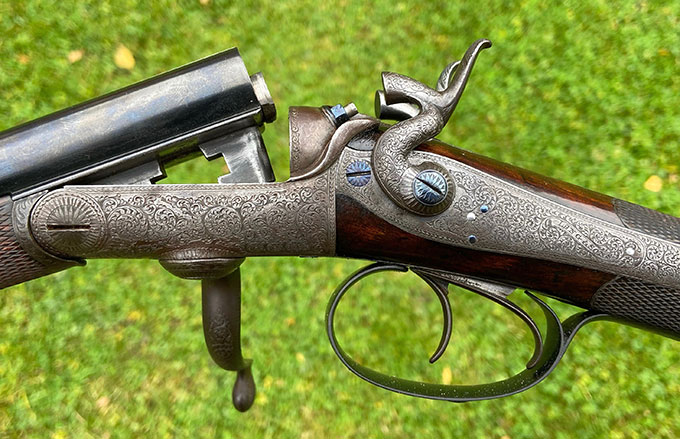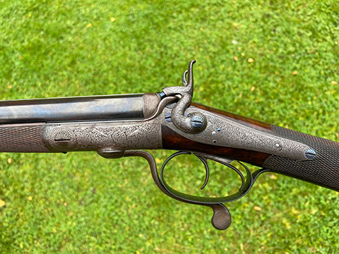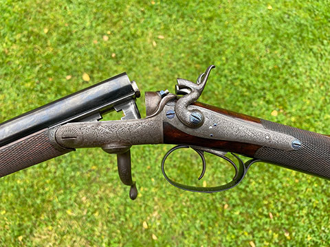 A very rare, high quality .410 hammer gun. Made circa 1880. 28" seel barrels, nitro re-proof in Birmingham for 3" nitro in 2020. Weighing just 5lbs, it has been fully and sympathetically restored to the highest standard by Vintage Guns Ltd. Non-rebound locks (beautiful quality), Jones screw-grip and under-lever action, fully scroll-engraved. Vacant silver oval in well figured stock, beautifully finished with Purdey slacum oil finish. This is the best quality .410 hammer gun we have had to date.