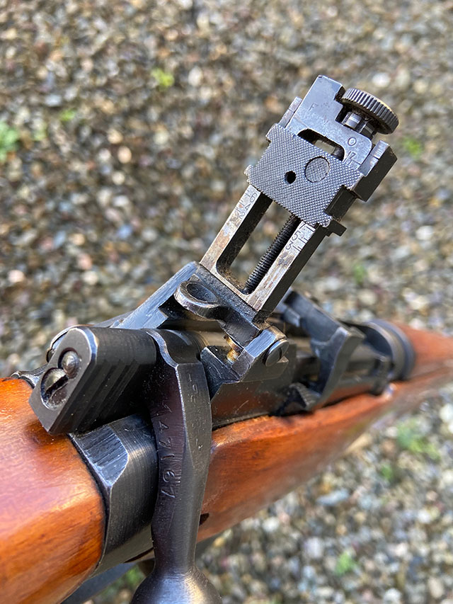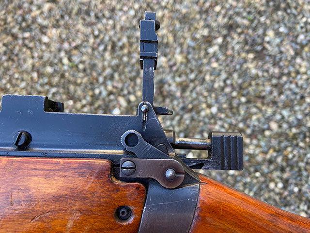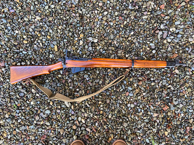 A Lee Enfield .303 service rifle converted to single-shot .410 shotgun. This appears to be a MK4 rifle, circa 1950s, un-issued. Converted to .410 with Proof House Certificate for Magazine Restriction in 2006. Very good condition, with webbing sling, elevating rear sight, fully working and Shotgun Certificate (Section 2) compliant.