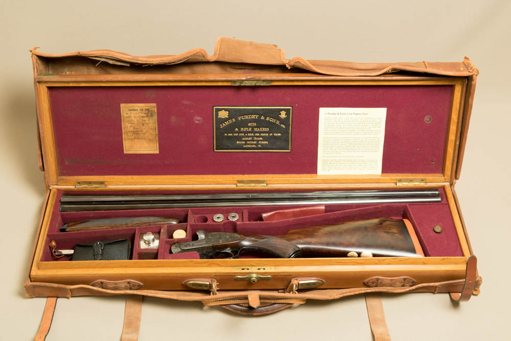 A beautiful, cased Purdey de-luxe, live-pigeon gun. Stunning deep carved fences, Monte-Carlo stock, raised, flat rib with intermediate bead. Beavertail forend. A very unusual and hard-to-find specification.