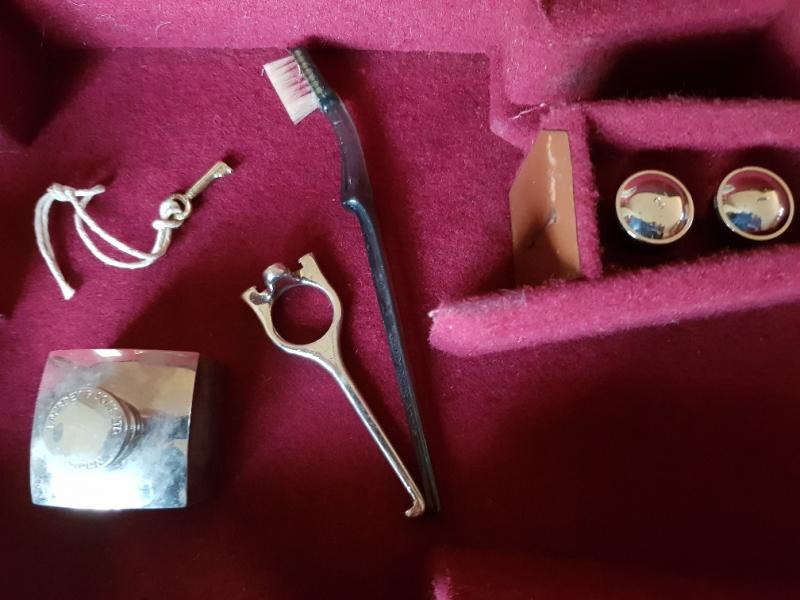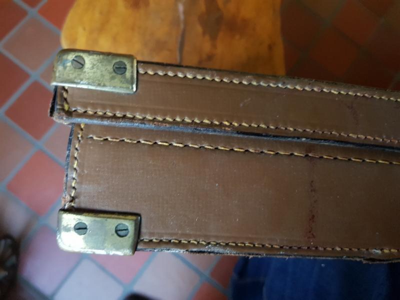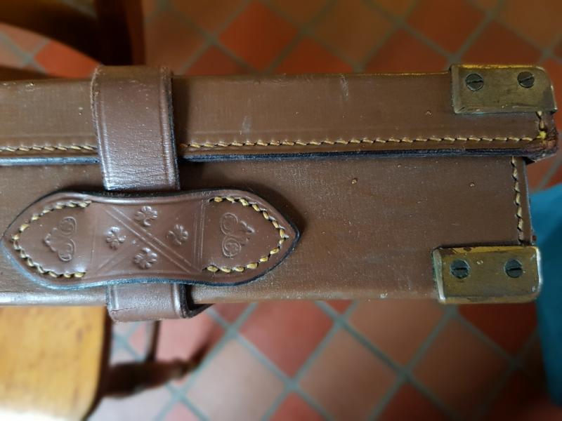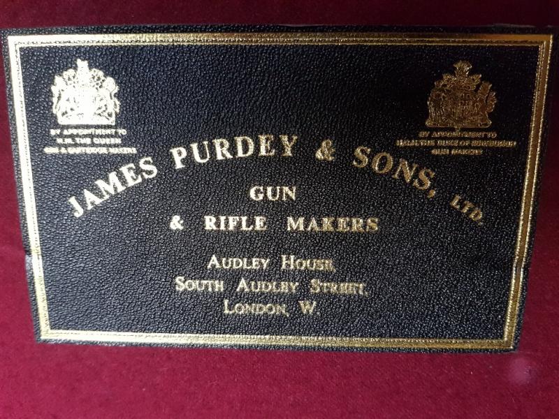 Purdey double gun case, in leather, with key, oil-bottle, striker pots and cartridge extractor. Red baise lined and blocked for a pair of 12-bores with 30" barrels.