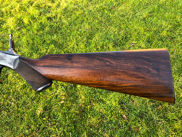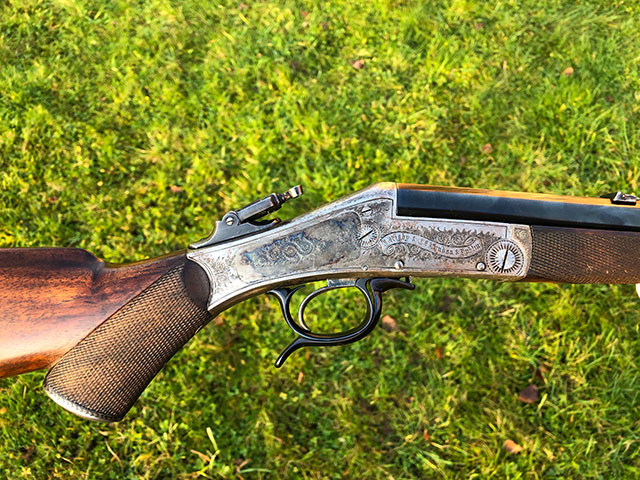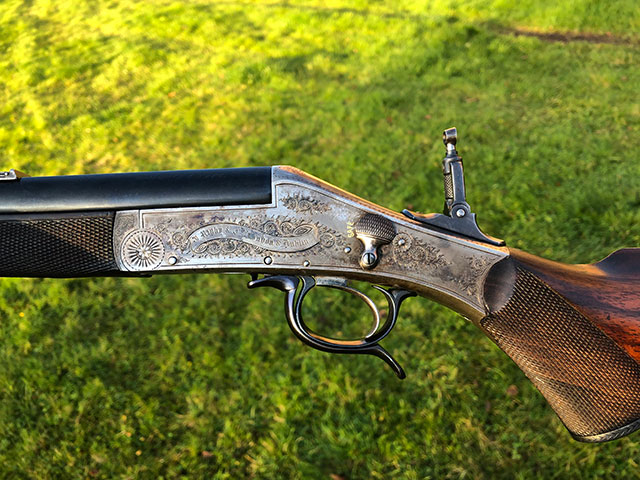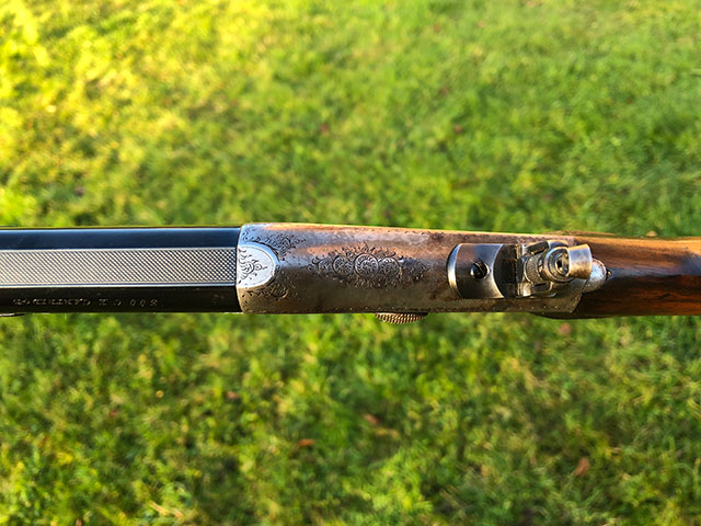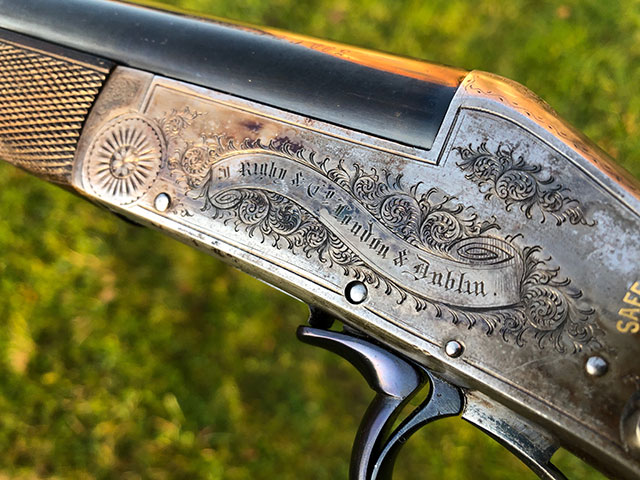 A rare hammerless rook rifle by Rigby 'London & Dublin' with snap under-lever action and side safety. Folding leaf sights to 50 and 100 yards, additional folding peep-sight. Folding fore sight. Nicely figured wood with pistol grip with engraved grip cap. Excellent bore.