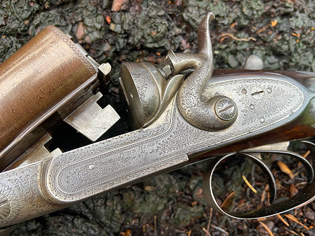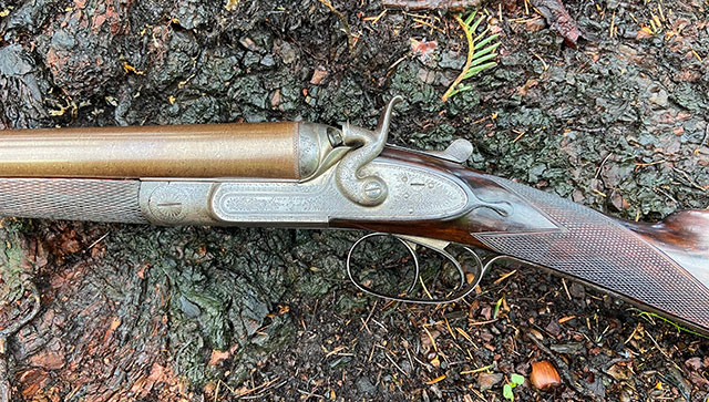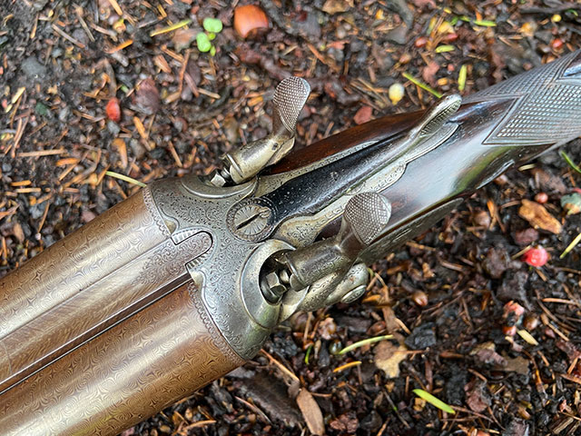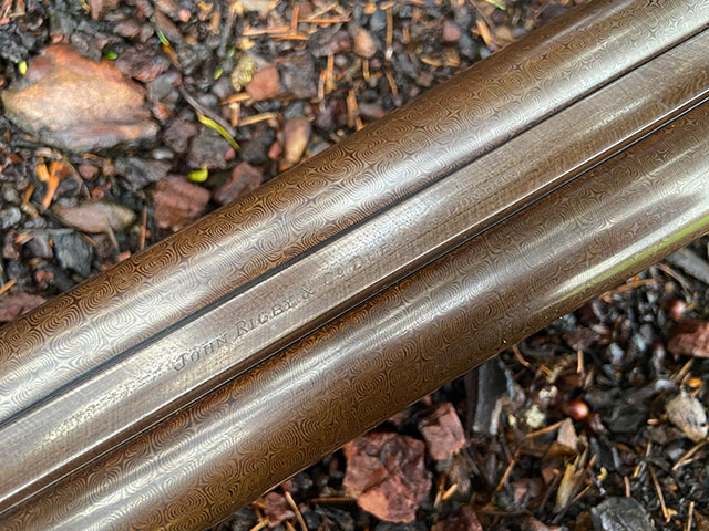 A nice bar-action Rigby hammer gun with rebound locks and good 30" Damascus barrels. Originally proofed under 1875 rules, re-proofed at .729" and re-browned, showing attractive figure and colour. Stock with nice figure and colour with some historic dents and scratches, chequer refreshed, heel and toe plates.