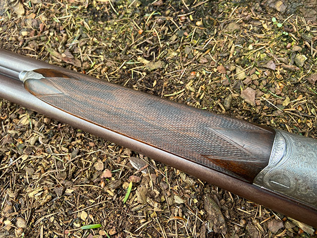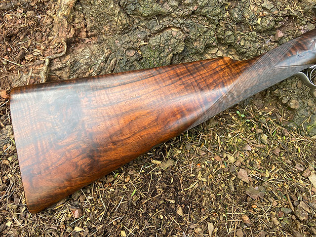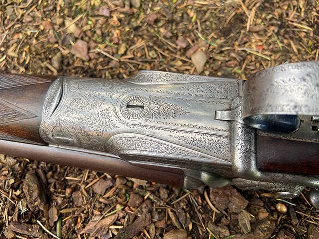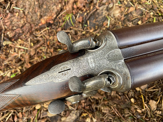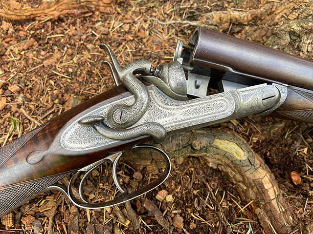 Best Stephen Grant 12-bore hammer gun, made in 1877 with E.C. Hodges patent side-lever and treble-bolted action. Rebounding bar locks, fine scroll engraving and a beautifully figured dark walnut stock. Bar action Grant side-levers are much less common than back action versions. This one is mechanically perfect and professionally restored. Its original proof marks remain valid.