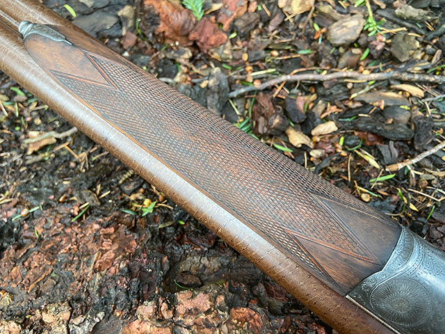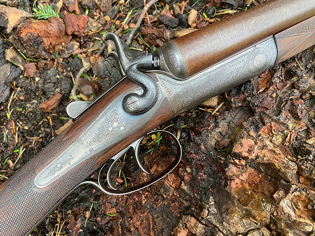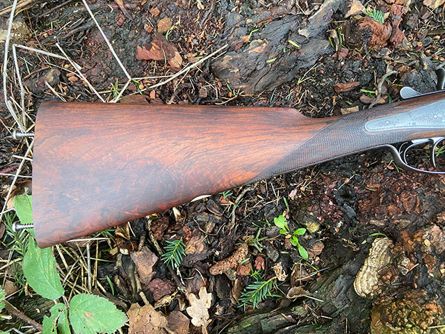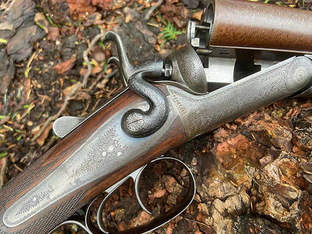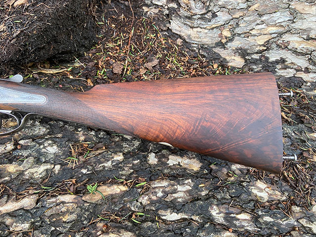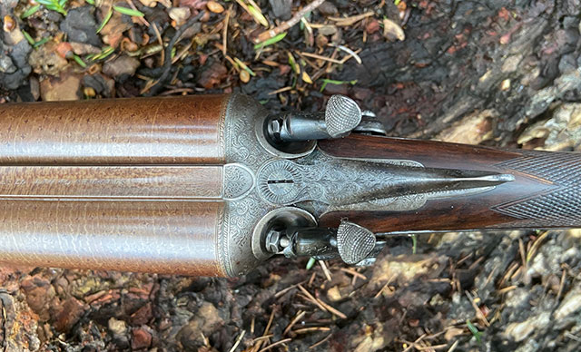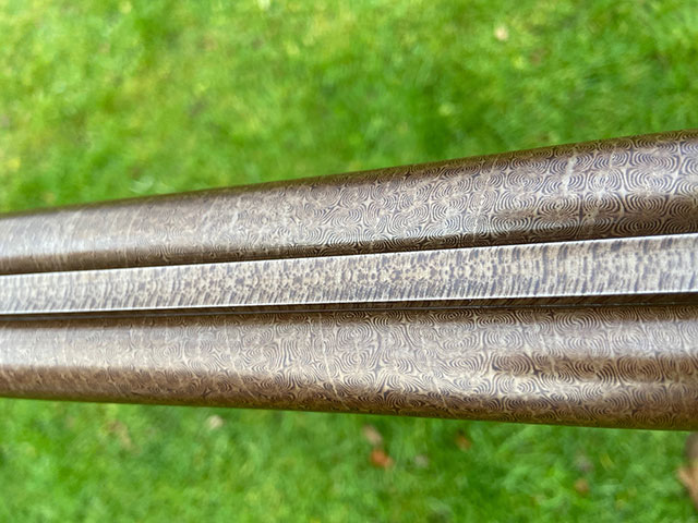 Made in 1882 and re-proofed for nitro after 1925, a very nice Grant top-lever hammer gun with Purdey bolt locking. Rebounding back-locks, pretty wood, excellent Damascus barrels and best quality throughout. Restored by us to the highest standards. Stock to be finished with leather covered Silvers pad and oil finished. Ready February 1st 2022.