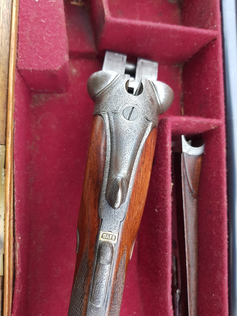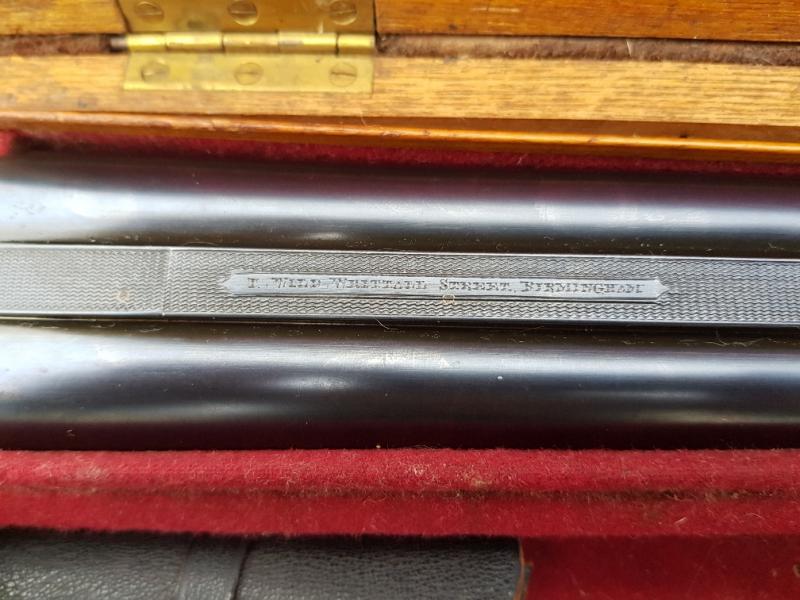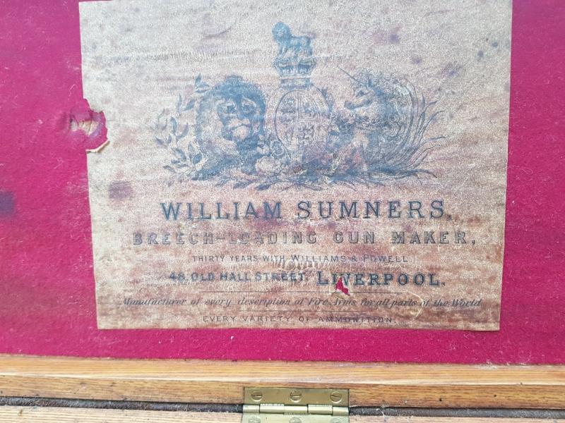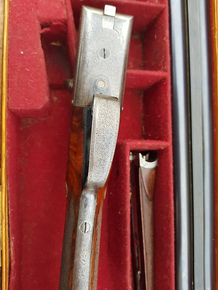 A pretty and unusual side plated boxlock non ejector by William Sumners. Action looks like a Westley Richards. Barrels well sleeved by T. Wild. The case has the initials CWMS, suggesting the gun was made for Sumners' son. The Middlesex Regiment earned the nickname 'Die Hards' at the battle of Alburerer in the Peninsular War, under the Duke of Wellington.