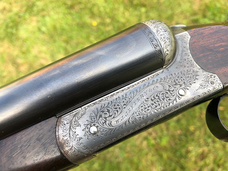 A very nice 12-bore boxlock non-ejector by W.J Jefffery, St James's St, London. Retaining a good percentage of case colours on the action and with nice, crisp engraving to all metal parts. Chequer in good order, pretty wood and a gold oval. This is a quality boxock without ejectors, in very sound condition. Recently serviced.