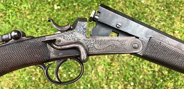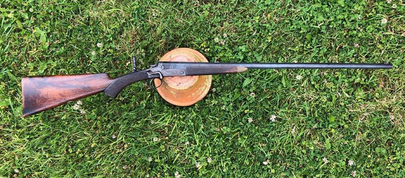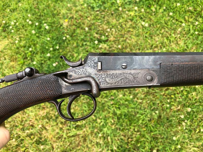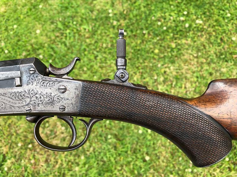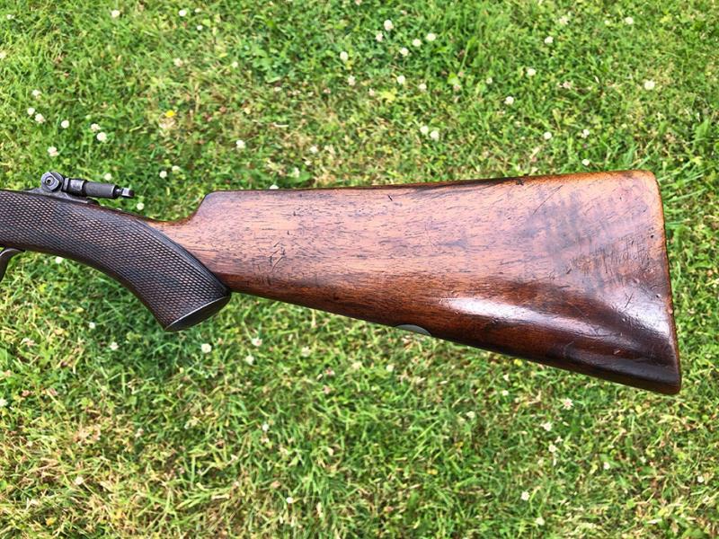 A lovely quality side-lever rook rifle converted to .410. Unrestored, lots of honest patina, iron sights and peep-sight. A very nice example, would be a good prospect to line and re-make into a rilfe.