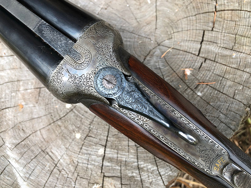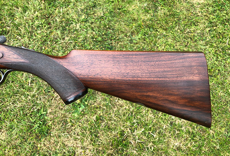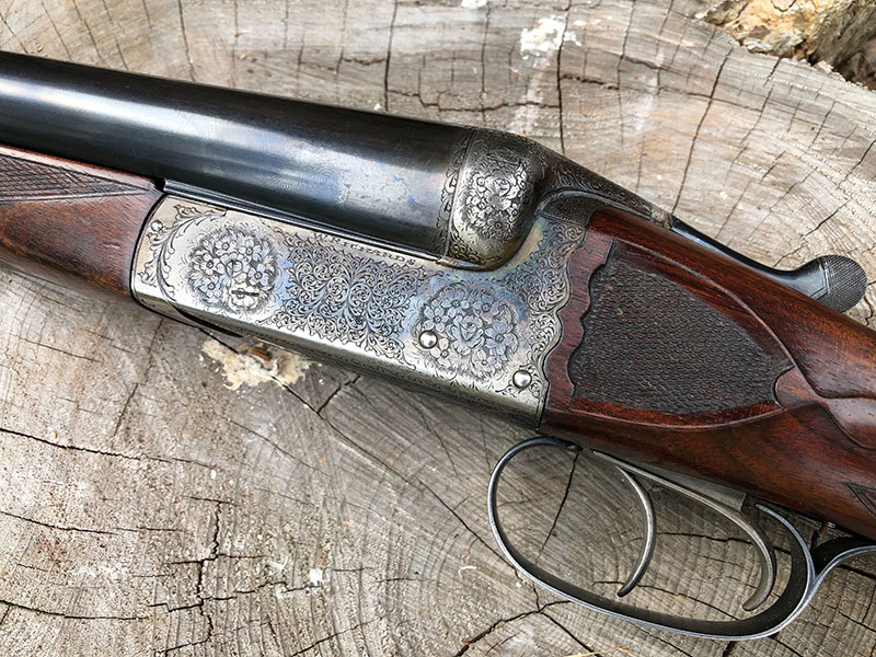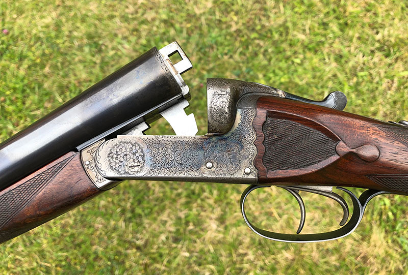 A super quality pigeon gun by W. Richards, treble-grip action with concealed Scott improved bolt and rib extension. Retaining close to 100% original case colour on metal parts. Top condition throughout with fine, high quality engraving of flowers and scrolls. With 3" chambers and at 7 1/2lbs, this is a gun with lots of potential.