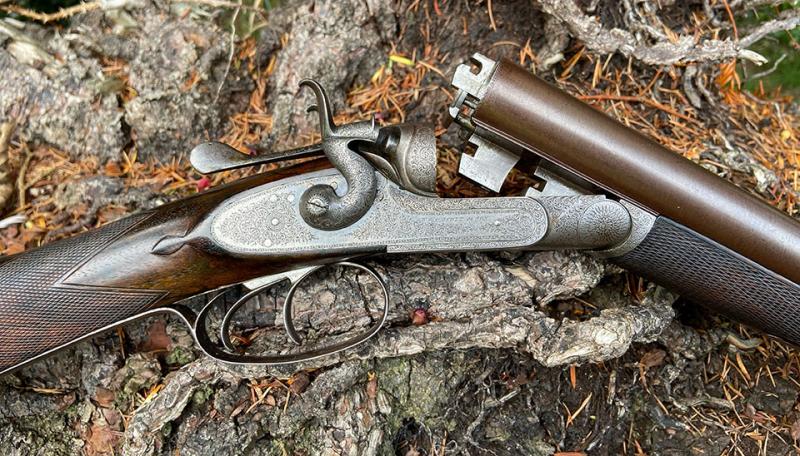 A best quality W&C Scott bar action hammer gun featuring several key Scott patents, including the 1865 Scott Spindle, the Triplex Grip bolted doll's head and the adjustable lump patent of 1887.Full coverage fine scroll engraving, percussion fences, highly figured walnut straigh hand stock. Some marks in the bores but a very shootable hammer gun of high quality.