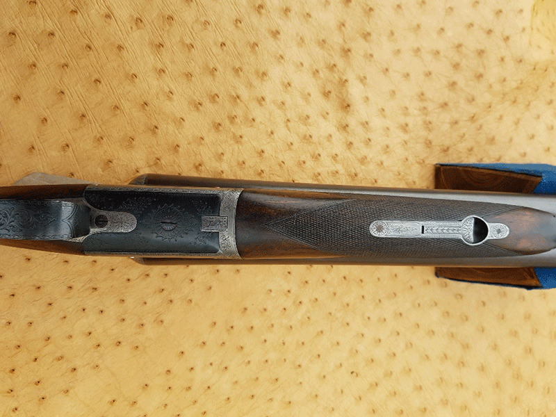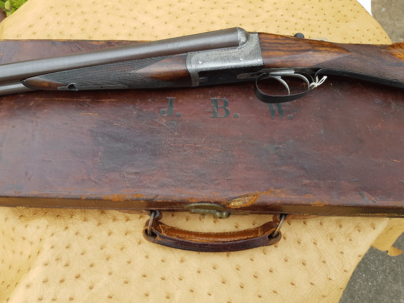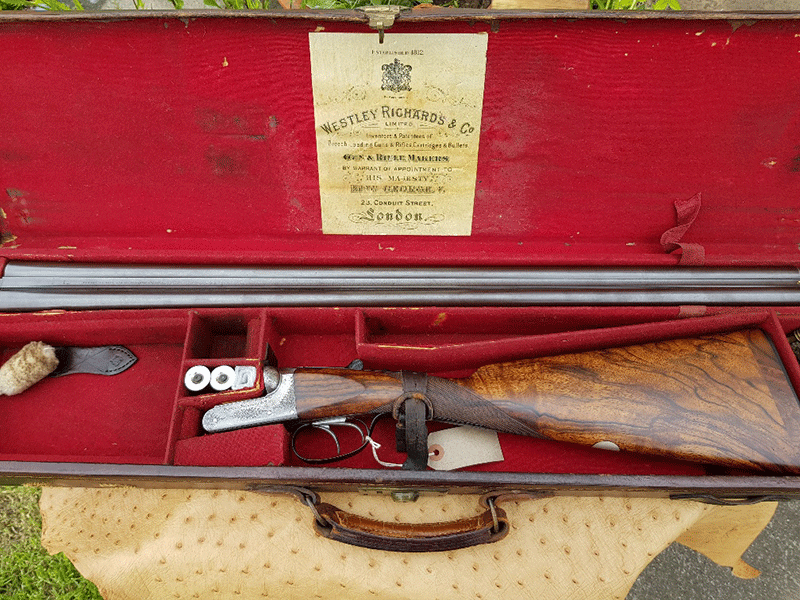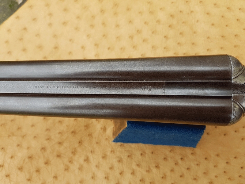 A good Westley Richards boxlock ejector with Damascus barrels, nitro proof with good bores.It was originally sold from Westley Richards' London shop and carries that address. No 2 of a pait. Very good overall and clean bores.