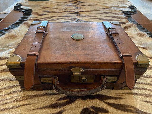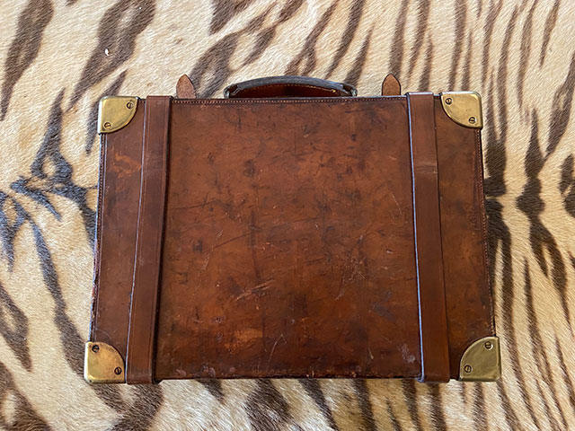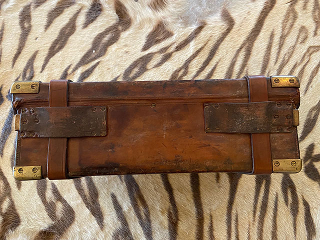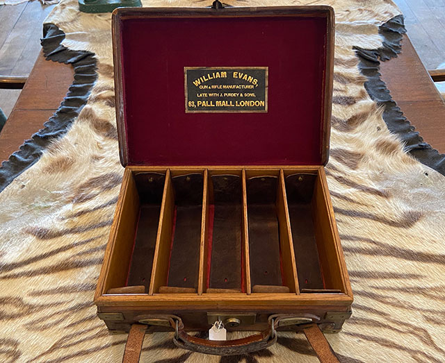 A really good oak and leather William Evans cartridge magazine. Brass corners and edge reinforcement strips, original oak dividers and internal leather straps in good condition. Leather is sound and not split or dried out. Dimensions are 16 1/2" x 11 1/2" x 5 1/2". William Evans trade label on inside lid.