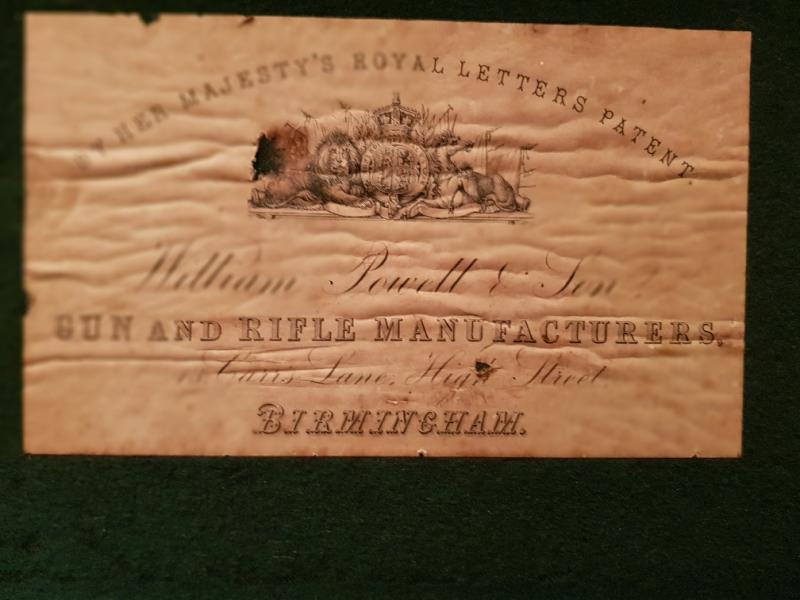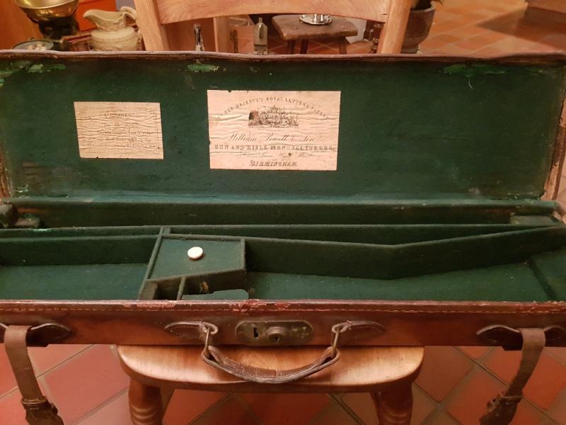 A good, original William Powell case for a hammer gun with 30" barrels, original baize lining and paper labels, leather in sound condition.