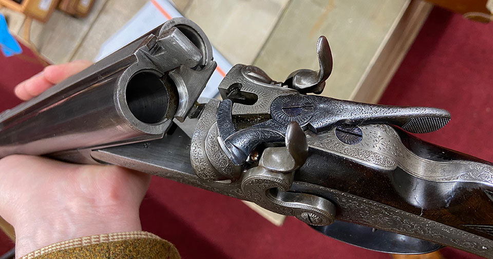 Last month, Holt’s sold a twelve-bore Tolley with a ‘Giant Grip. top-lever, but this one had the thumb tab on the end of the lever reversed. The gun gives every impression that it was made as a double rifle or (more probably) a shot-and-ball gun. The sights, marked for 100 yards, would not be much use on a dedicated bird gun. This impression is backed up by the weight, at 9lbs 13oz, eyes to carry a sling and the colonial career of the owner.