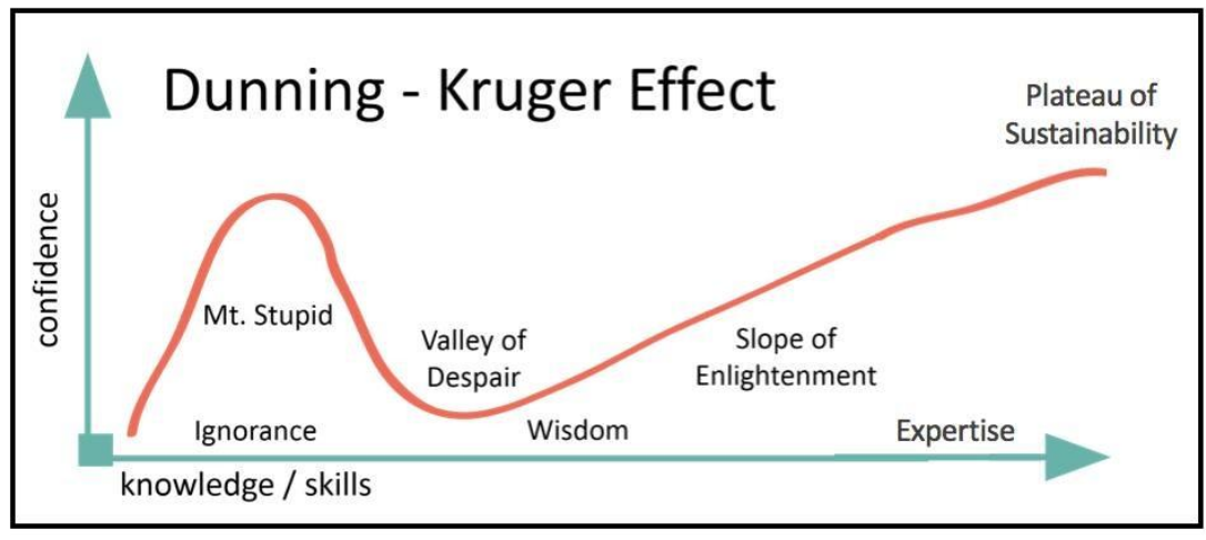 The Dunning-Kruger effect & capability development. @RealMikeRother says, “most of us can probably recall having stood on Mount Stupid at one time or another.” Ouch! (In this diagram, 100% confidence only occurs on Mt. Stupid, as thinking scientifically means never being 100% certain.)