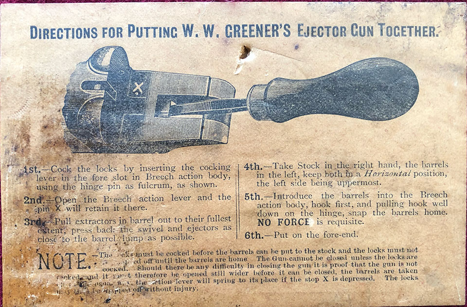 The case lid of many a Greener shotgun carried this paper label in addition to the trade label at the top of this article.