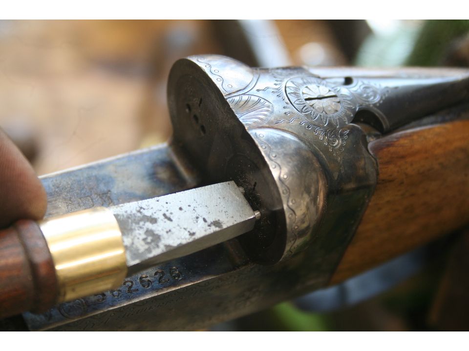 As with many things shotgun there is seemingly no standard, you cannot simply go down to Screwfix and buy a tool for removing the discs even if you could you’d quickly find that the tool that fitted an AYA would not fit a vintage side by side. Faced with these problems some of the time on a job is given over to tool making, I keep a few blank steels in handles for these jobs. I was once told by an old hand in the trade, a good gunsmith should be a good tool maker; I’m not sure I can claim to be the latter however these tool making tasks are common in the workshop and are a good time to exercise some file work basics that I employ to make tools quickly and efficiently in the workshop.