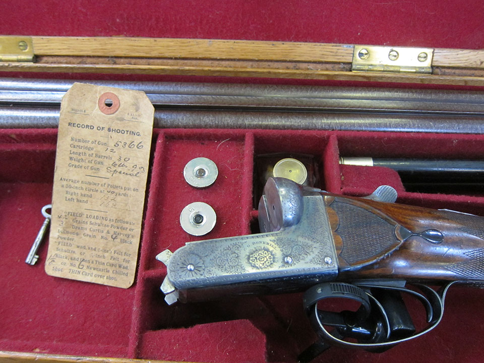 This unusually high quality and well finished boxlock by C.G. Bonehill is just such a find. Gun No.5366 is accompanied by detailled data pertaining to the regulation of the gun and the loading of the cartridges.